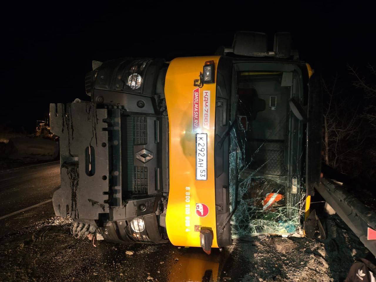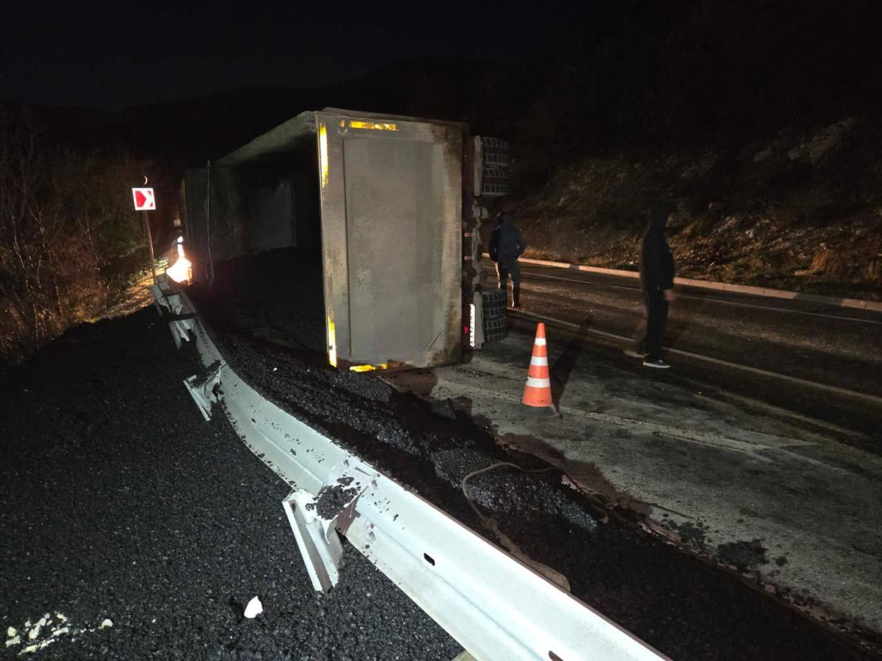 Большегруз перевозил асфальт. На трассе между Новороссийском и Геленджиком водитель не справился с управлением, и фура опрокинулась.
