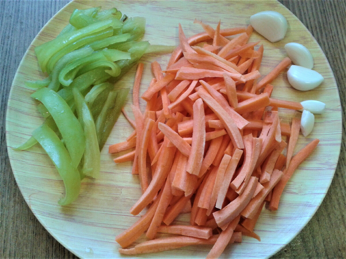 Первым делом подготовьте овощи: нарежьте морковь и перец тонкими полосками, а кабачки – брусочками. Затем в глубокой сковороде разогрейте растительное масло на среднем огне. Добавьте нарезанную морковь и обжаривайте ее в течение нескольких минут, постоянно помешивая. После этого добавьте кабачки и перец, продолжайте жарить еще 5-7 минут до мягкости овощей.