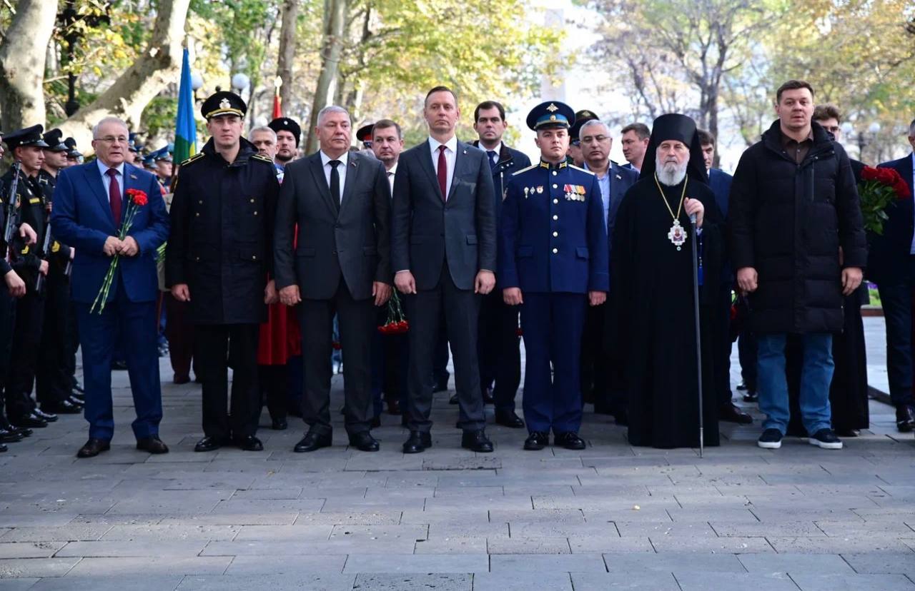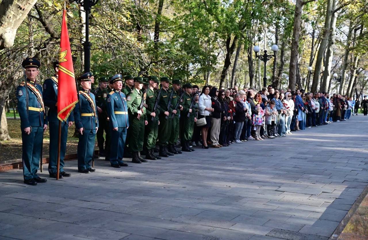 Собравшиеся на площади Героев стали участниками акции памяти и после Минуты молчания возложили цветы к мемориальной стене «Сынам Отчества, чей прах покоится у стен Новороссийска». Под звуки духового оркестра почетным маршем прошли военнослужащие Новороссийского гарнизона.