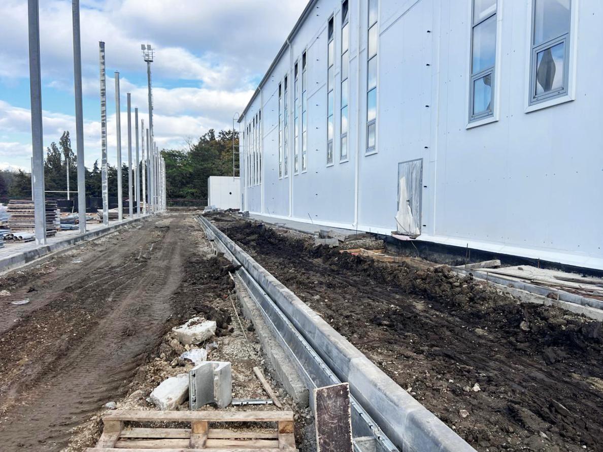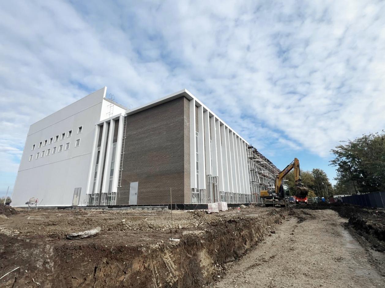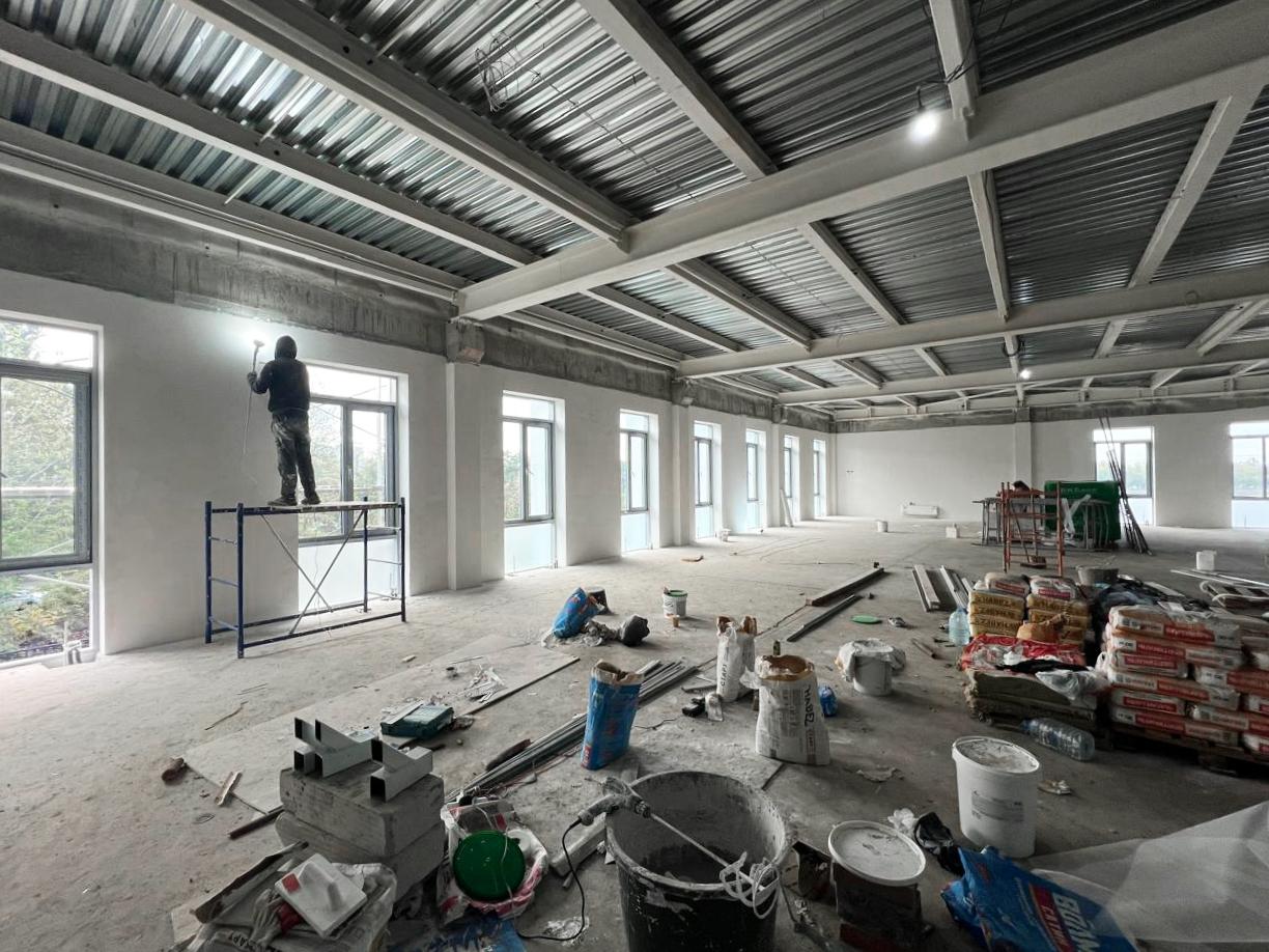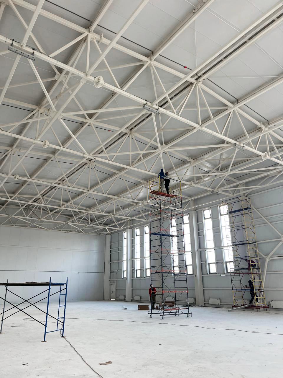 Сейчас в здании выполняют внутреннюю отделку, монтируют дверные блок, обустраивают скалодром и устанавливают декоративные фасадные плиты.