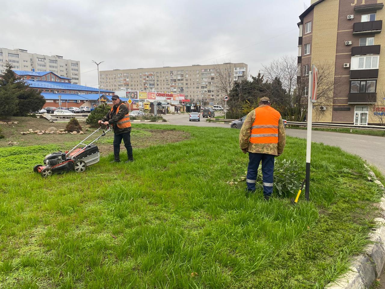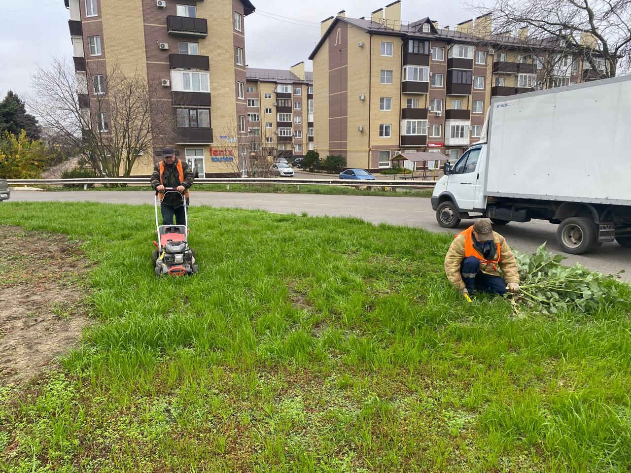 Покос сорной растительности на пересечении улиц Красной и Коммунистической (кольцо), по ул. Коммунистической, от ул. Щорса до ул. Красной и уборка скошенной травы.