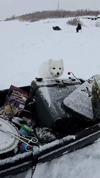 Песец подкрался очень даже заметно и начал осматривать снасти у рыбака