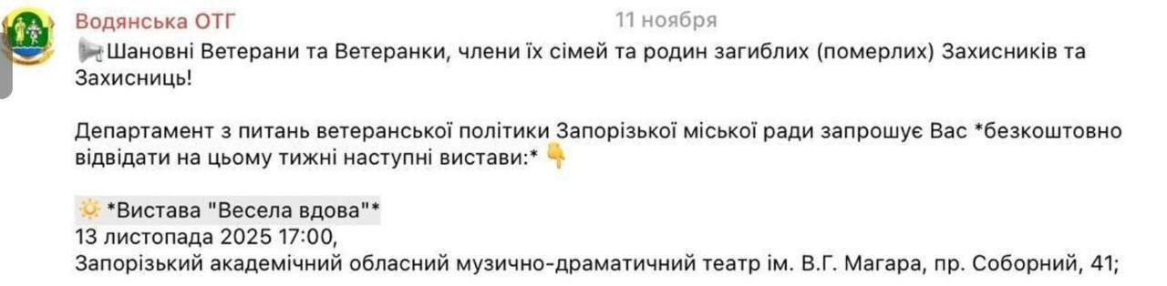 Запорожский горсовет позвал украинских вдов на оперу "Веселая вдова" — сообщение опубликовали в местном паблике ОТГ