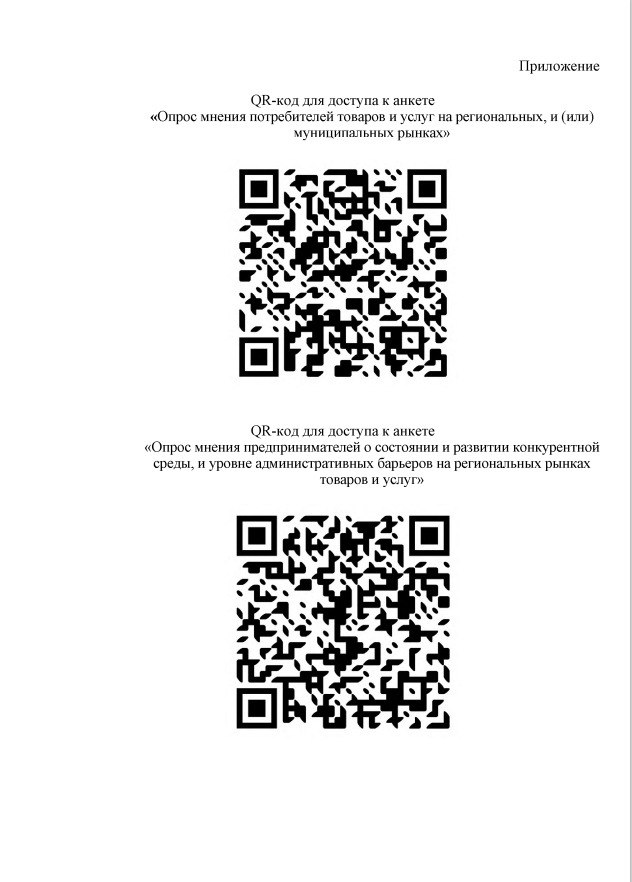 В соответствии с распоряжением Правительства Российской Федерации от 17 апреля 2019 г. No 768-р «Об утверждении стандарта развития конкуренции в субъектах Российской Федерации» министерством, как уполномоченным органом по содействию развитию конкуренции в Краснодарском крае, организовано проведение ежегодного мониторинга состояния и развития конкуренции на товарных рынках Краснодарского края (далее – мониторинг) в период с 1 ноября 2025 г. по 30 ноября 2025 г. Мониторинг предусматривает исследование удовлетворенности качеством товаров, работ и услуг со стороны потребителей, выявление проблемных вопросов для представителей бизнеса, а также наличия административных барьеров, влияющих на развитие конкуренции в Краснодарском крае. Опрос субъектов предпринимательской деятельности и потребителей товаров и услуг осуществляется по анкетам, размещенным на официальном сайте министерства в разделе «Опросы» подразделе «Ежегодный мониторинг состояния и развития конкуренции на товарных рынках Краснодарского края» в информационно-телекоммуникационной сети «Интернет» (https://forms.yandex.ru/u/6900ae8a4936392dbf93767c – опрос предпринимателей, https://forms.yandex.ru/u/6900786e02848f1fba221dac – опрос потребителей). Анкетирование также можно пройти при помощи считывания смартфоном QR-кодов.