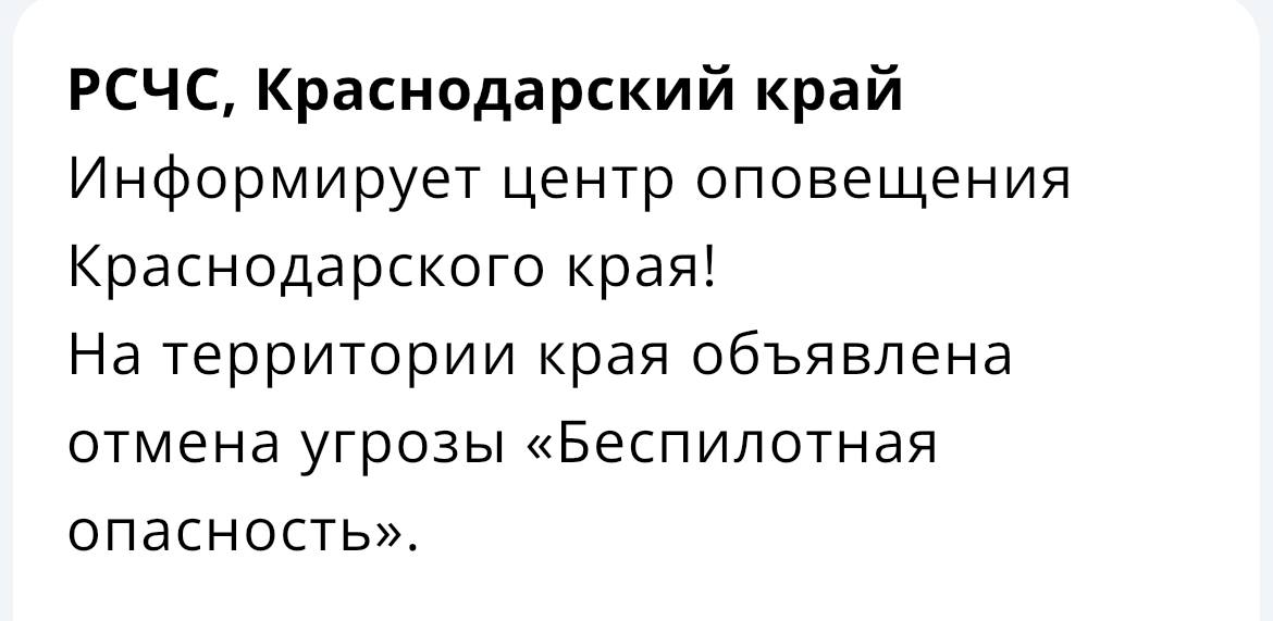 Угроза атак беспилотных летательных аппаратов снята.Благодарю всех за соблюдение рекомендаций по безопасности.Подписывайтесь на мой канал в MAX