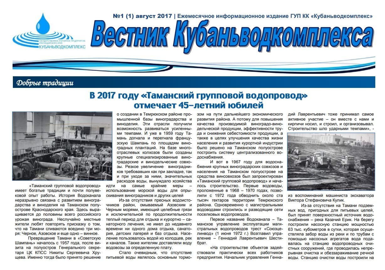 Первое издание газеты «Вестник Кубаньводкомплекса» осуществлено в августе 2017 года, практически с момента образования предприятия.