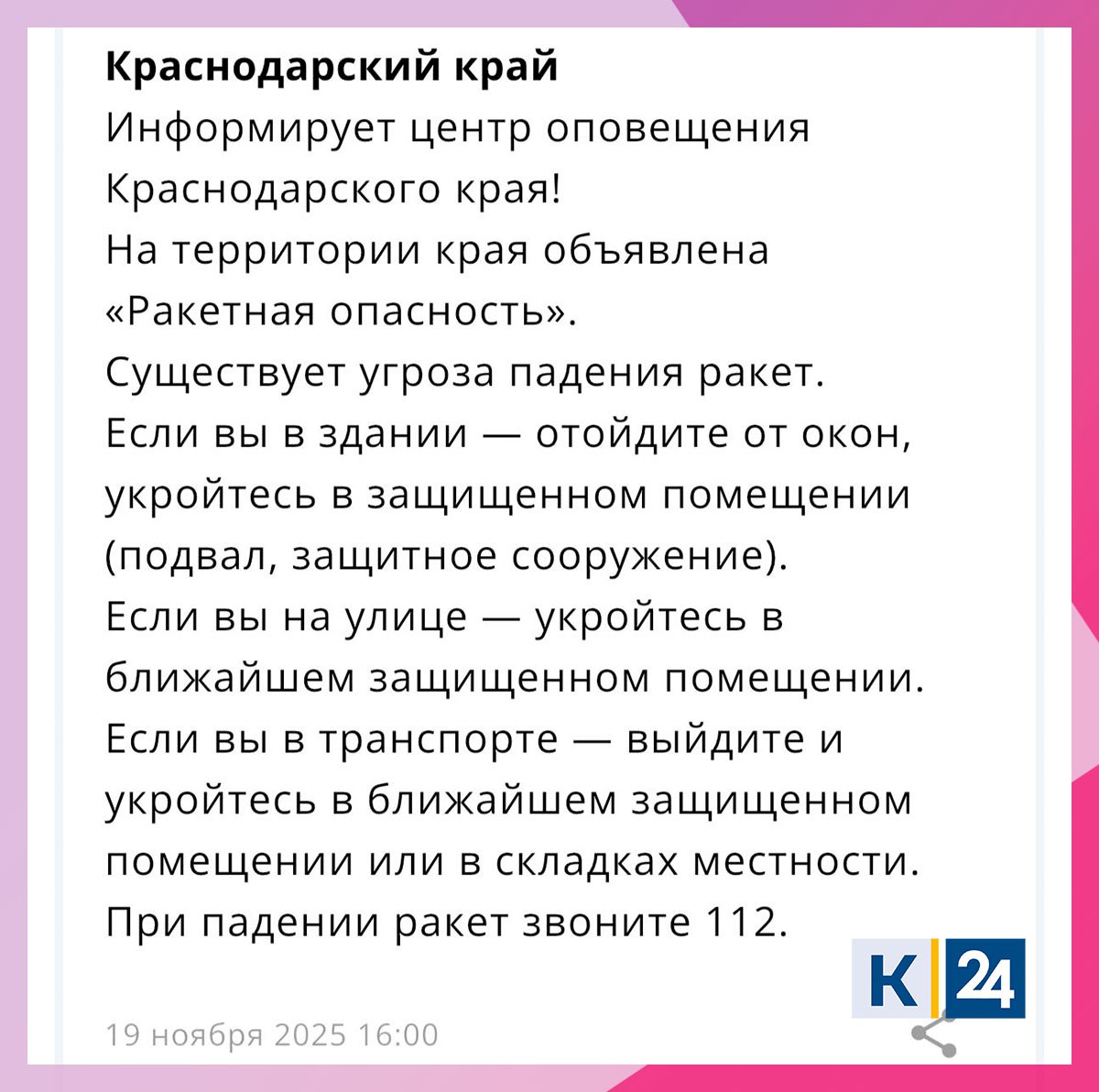Оповещение пришло жителям региона в официальном приложении МЧС России.Временные ограничения введены в аэропорту Геленджика, сообщает Росавиация.Быть в курсе | Мы в MAX