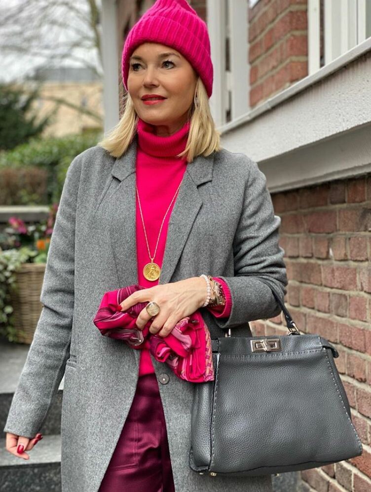 1. Насыщенно-розовая вязаная шапка привнесет в ваш образ яркие нотки. Сочетайте её с ярко-розовой водолазкой и фиолетово-розовыми брюками, дополненными жемчужно-серым пальто. Этот контраст создаст эффектный стильный вид.