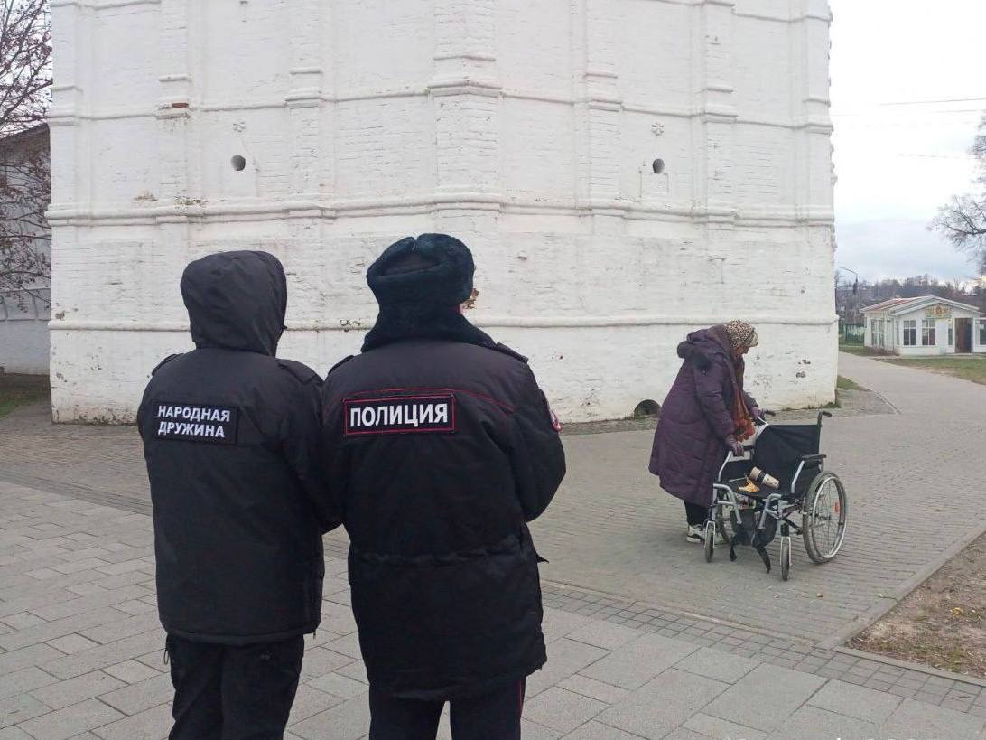 Пожилая женщина в инвалидной коляске просила милостыню, но при виде дружинников и полиции вдруг встала и быстро ушла.