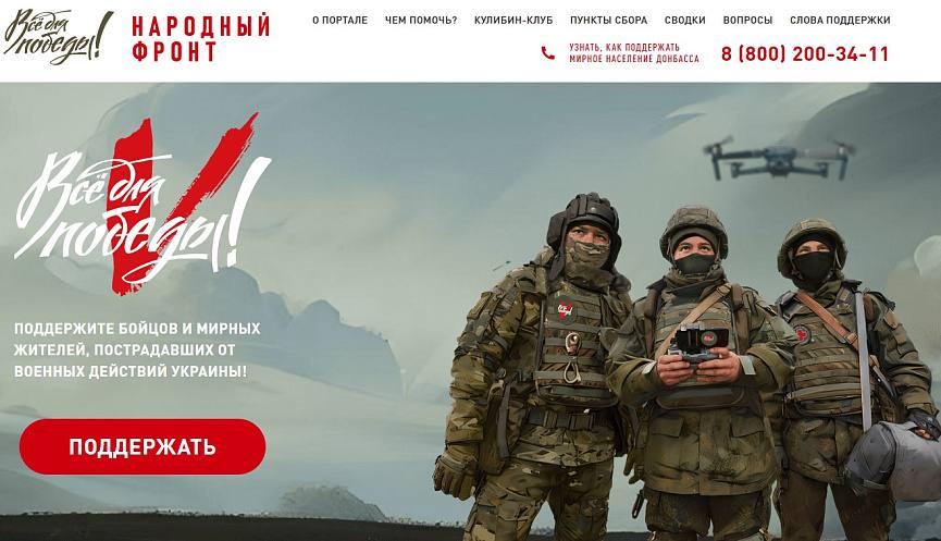 «Военные действия постоянно требуют новых ресурсов. Автомобили, дроны, все вещи, которые мы собираем или закупаем для ребят на передовой, – расходный материал, необходимый военным ежедневно. Есть огромный запрос на средства обнаружения и подавления беспилотников. Своевременная помощь помогает сберечь жизни и здоровье ребят. И самое главное, получая эту помощь, бойцы в окопах чувствуют поддержку, видят, что за их спинами – вся Россия!» - говорится на сайте проекта.