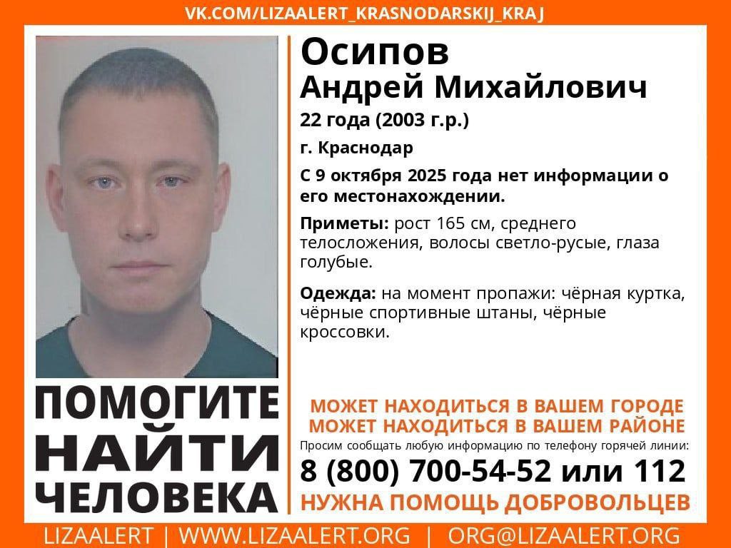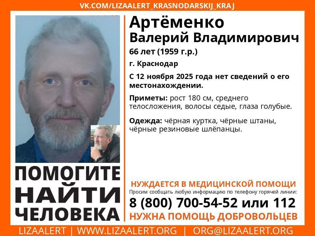 22 ноября на странице «ЛизаАлерт» Краснодарского края появилась информация о пропаже двух жителей Краснодара. 66-летний Валерий Владимирович Артеменко пропал 12 ноября 2025 года. До сих пор о его местонахождении ничего неизвестно.С 9 октября ведутся поиски еще одного жителя Краснодара — 22-летнего Андрея Михайловича Осипова.