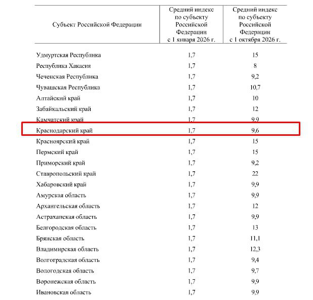 В Краснодарском крае он вырастит сначала на 1,7% с 1 января 2026 года. А с 1 октября еще на 9,6%.