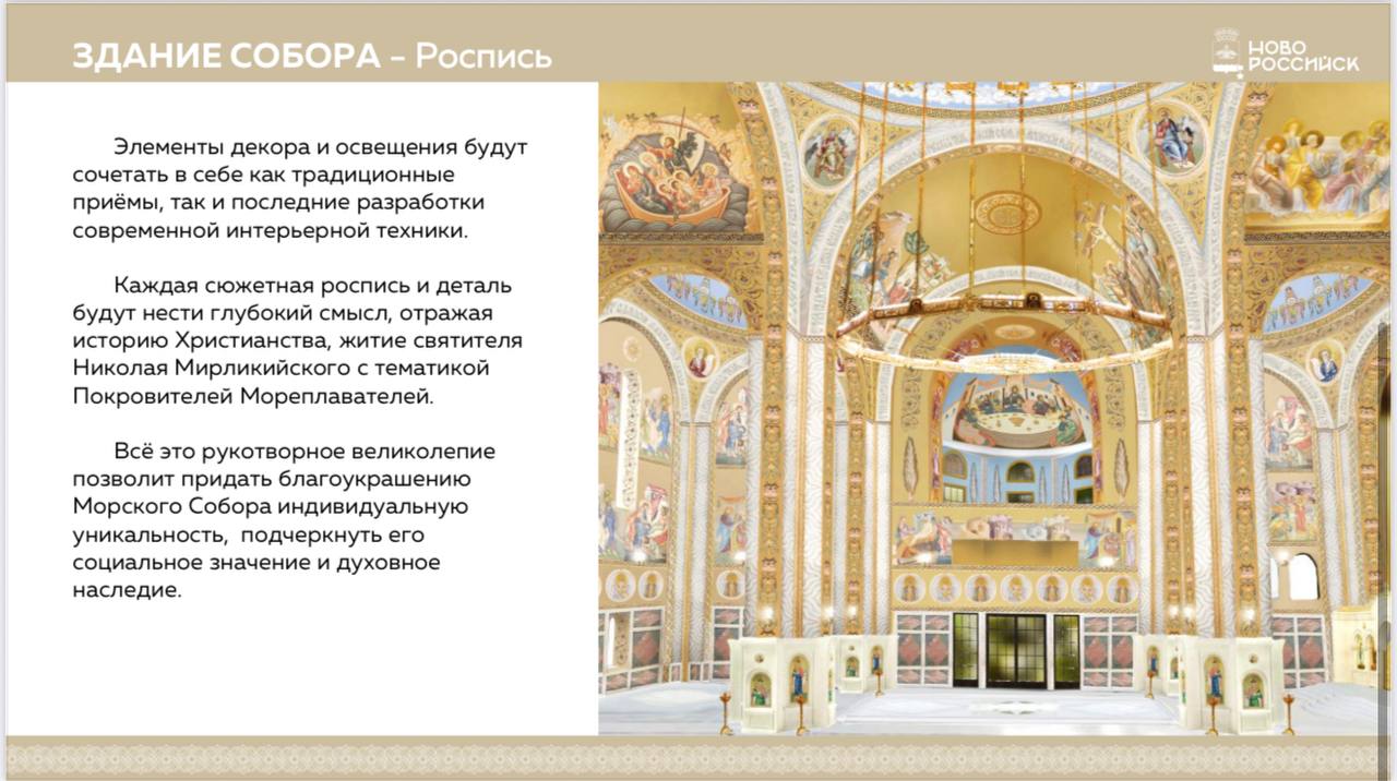 Особое внимание уделяется внутреннему убранству собора. Иконы для киотов и иконостаса будут созданы мастерами из «Палехской Палитры». Они будут выполнены в строгом соответствии с канонами византийского стиля и традиционной иконописной техникой. Планируется использовать современные силикатные материалы, специально подобранные с учетом особенностей морского климата Новороссийска. Элементы декора и освещения будут сочетать в себе как традиционные приёмы, так и последние разработки современной интерьерной техники. Каждый элемент росписи и декора будет нести глубокий смысл, связанный с историей христианства, житием небесного покровителя собора – святителя Николая Мирликийского, а также с тематикой Покровителей Мореплавателей.