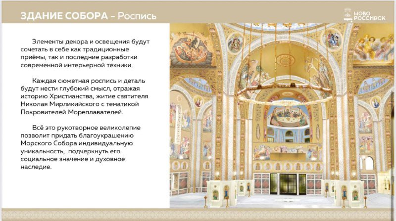 «Особое внимание уделяется внутреннему убранству собора. Иконы для киотов и иконостаса будут созданы мастерами из «Палехской Палитры». Они будут выполнены в строгом соответствии с канонами византийского стиля и традиционной иконописной техникой. Планируется использовать современные силикатные материалы, специально подобранные с учетом особенностей морского климата Новороссийска. Элементы декора и освещения будут сочетать в себе как традиционные приёмы, так и последние разработки современной интерьерной техники. Каждый элемент росписи и декора будет нести глубокий смысл, связанный с историей христианства, житием небесного покровителя собора – святителя Николая Мирликийского, а также с тематикой Покровителей Мореплавателей», - рассказал в своих соцсетях Андрей Кравченко, подводя итоги встречи.