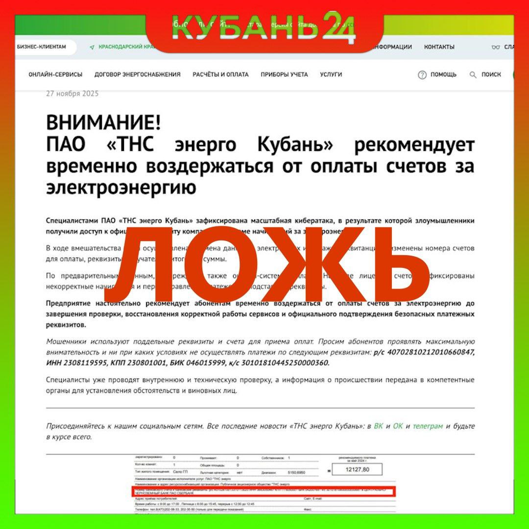 Внимание, ложь: сайт «ТНС Энерго Кубань» якобы взломали и поэтому счета за свет лучше не оплачивать.