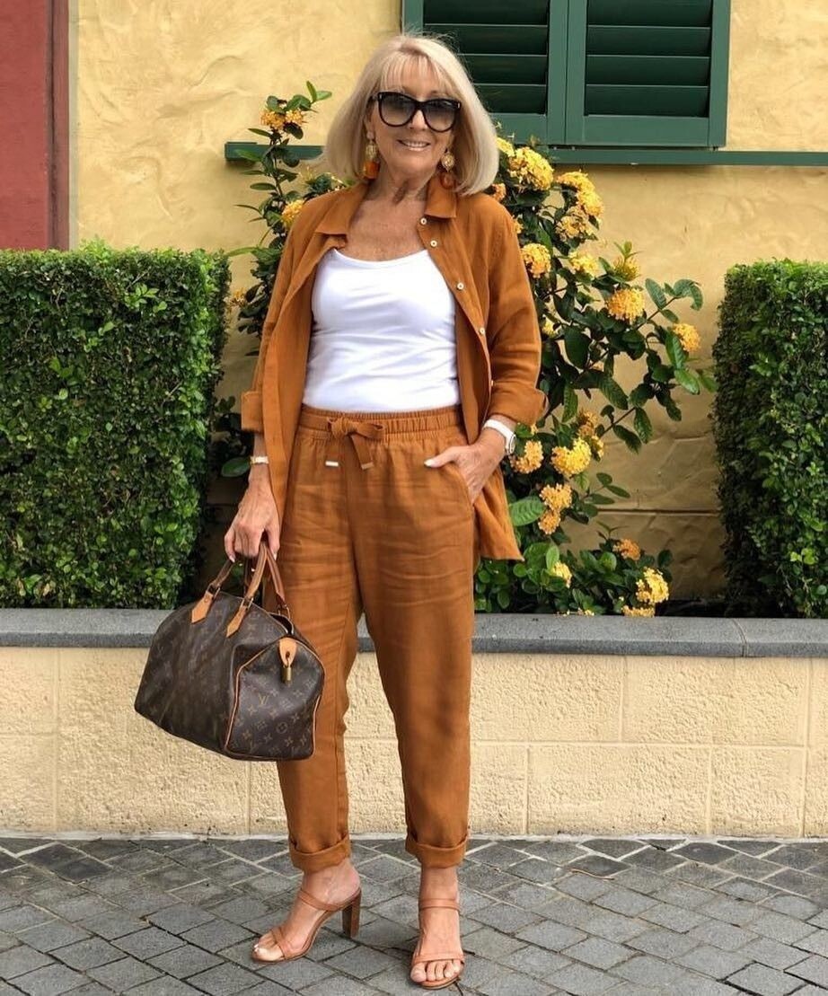 1. Льняной костюм в кофейном оттенке: Легкие зауженные брюки и удлиненная рубашка с рукавами до локтей образуют идеальный ансамбль для жаркой погоды. Этот стиль не только выглядит модно, но и обеспечивает комфорт. Дополнить образ можно белоснежным топом и сандалиями на невысоком устойчивом каблуке.