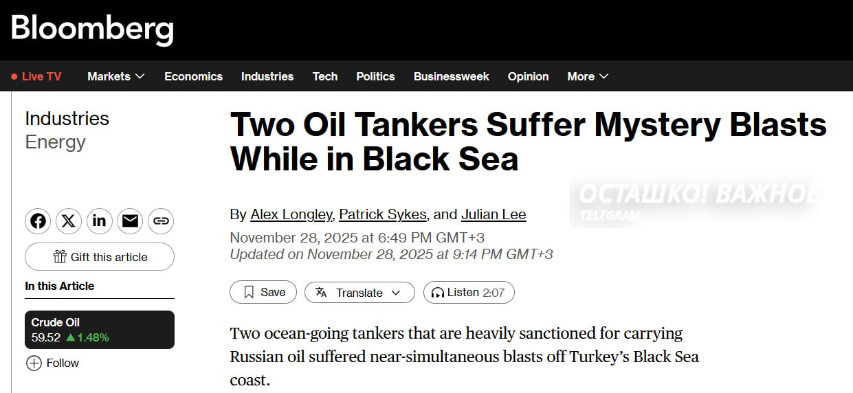 У берегов Турции подорваны два танкера «теневого флота» России — Bloomberg