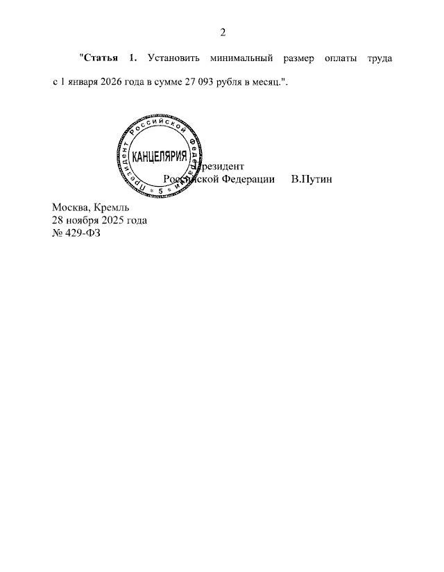 Президент утвердил МРОТ в размере 27 093 рублей на 2026 год