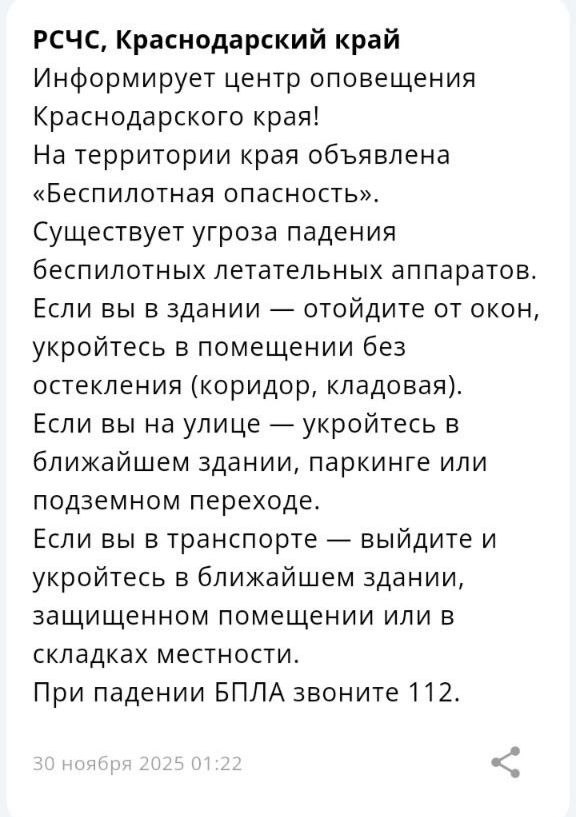 Опасность БПЛА объявлена в Краснодарском крае// Украина.ру