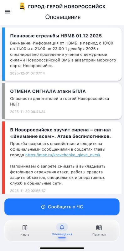 Кроме того, приложение интегрировано с муниципальной системой оповещения. Вы будете получать PUSH-уведомления о поступающих угрозах, их отмене, плановых учениях НВМБ и другой жизненно важной информации. Также есть функция для оперативной отправки сообщений в службу «Безопасный город» о чрезвычайных ситуациях, обнаружении БПЛА или их обломков. Добавили и раздел с актуальными памятками, которые подскажут, как действовать в различных экстренных ситуациях. Приложение еще модернизируется и будет дополняться.