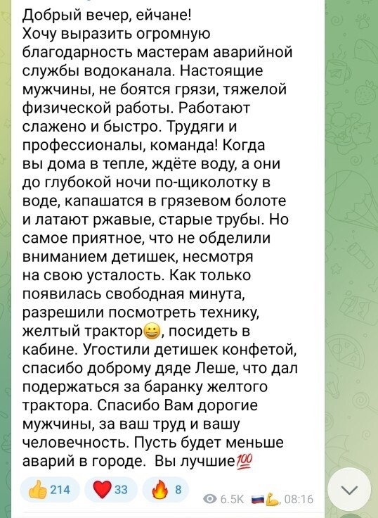 Выдержка из текста: «Хочу выразить огромную благодарность мастерам аварийной службы водоканала. Настоящие мужчины, не боятся грязи, тяжелой физической работы. Работают слаженно и быстро. Трудяги и профессионалы, команда!… Спасибо вам дорогие мужчины, за ваш труд и вашу человечность. Пусть будет меньше аварий в городе. Вы лучшие».