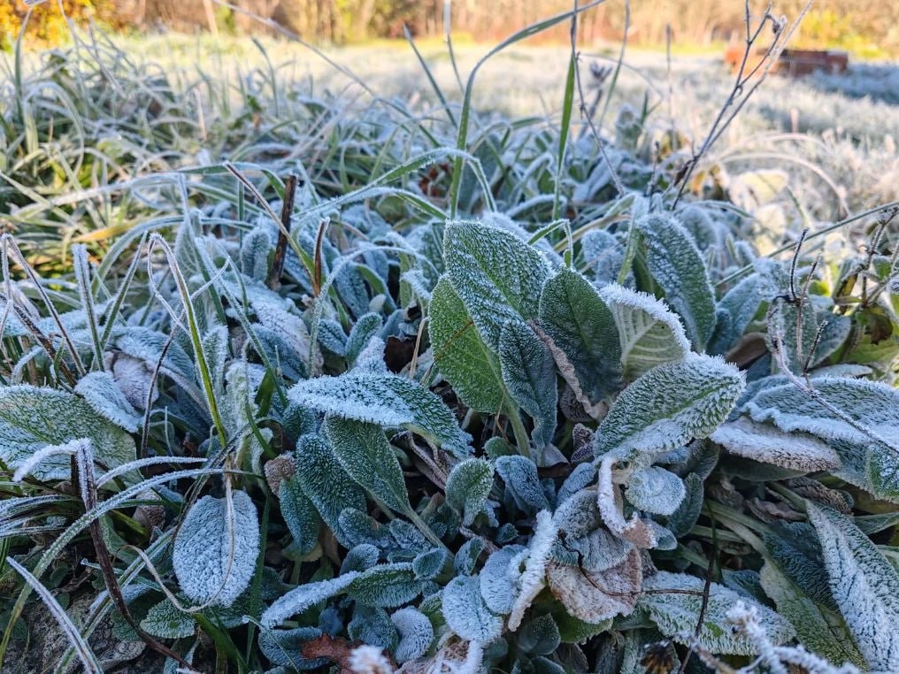 Иней укрыл цветы и травы сегодня утром в Апшеронске.