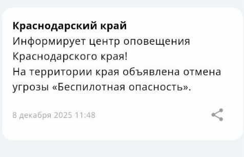 «Беспилотную опасность» отменили на территории Краснодарского края.