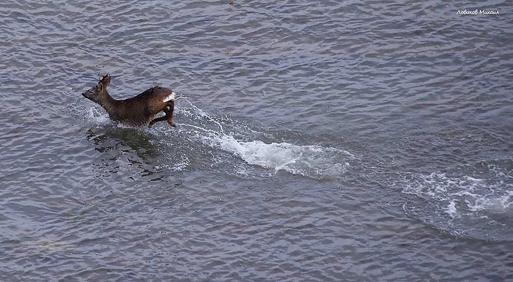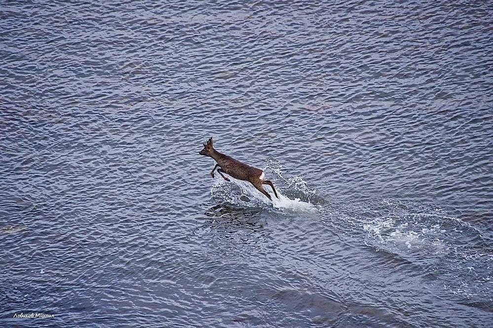 Оказалось, этот случай это не единичный. Несколько назад фотограф видел, как рыбаки на лодке отогнали плывущую косулю к берегу.