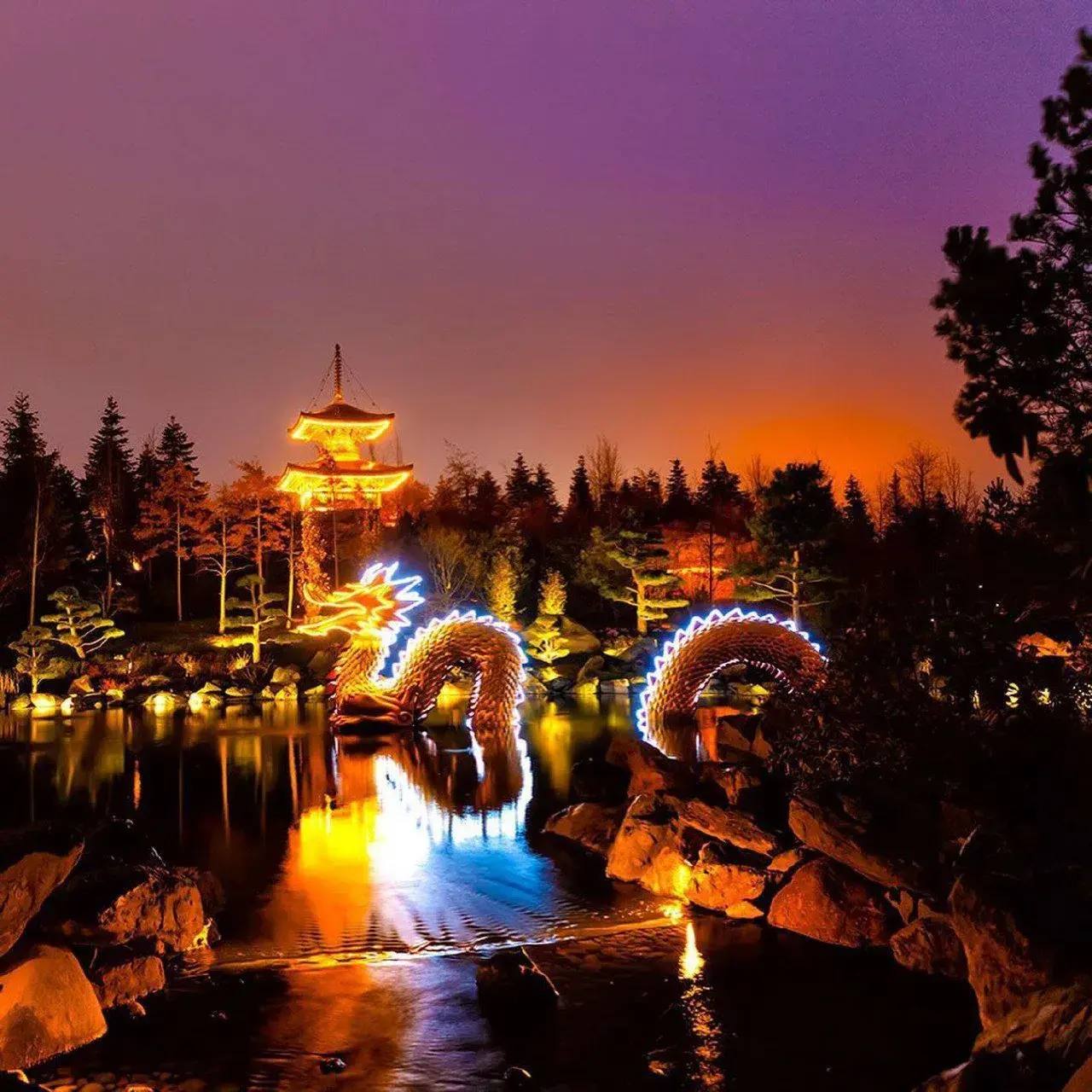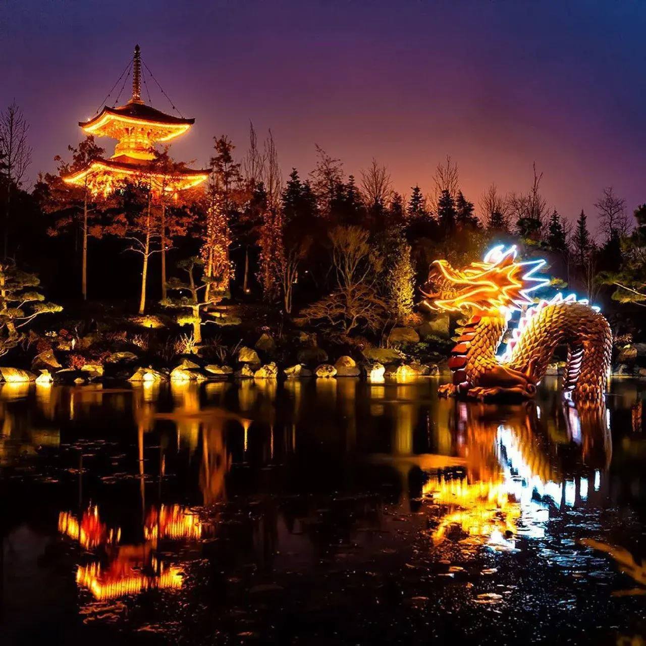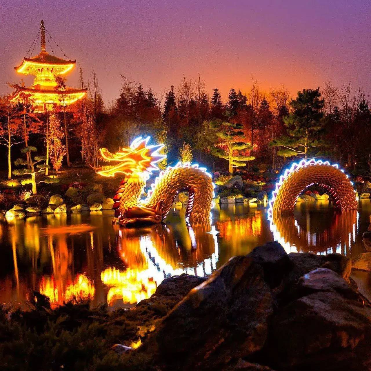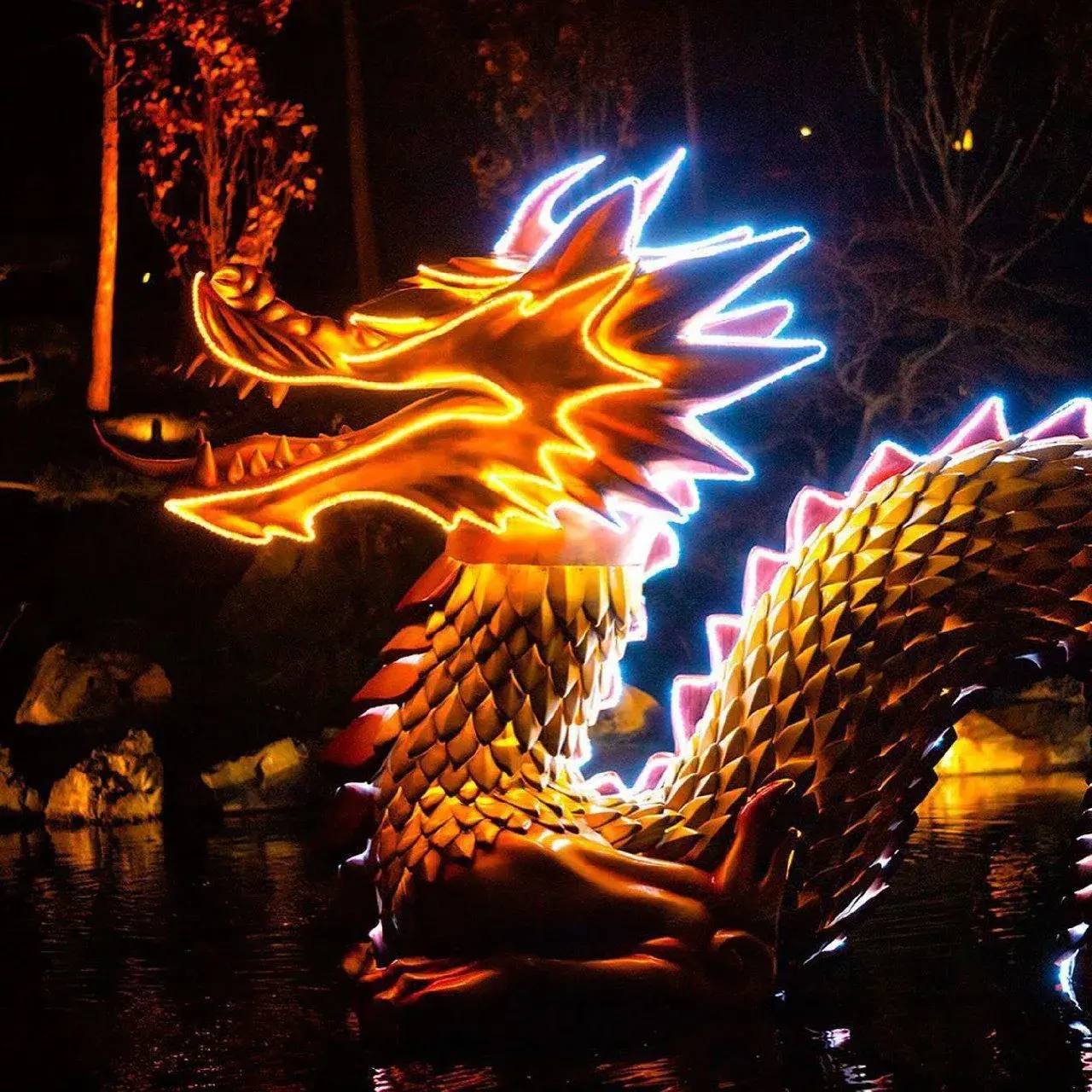 Дракон в пруду светится и кажется живым сказочным персонажем.