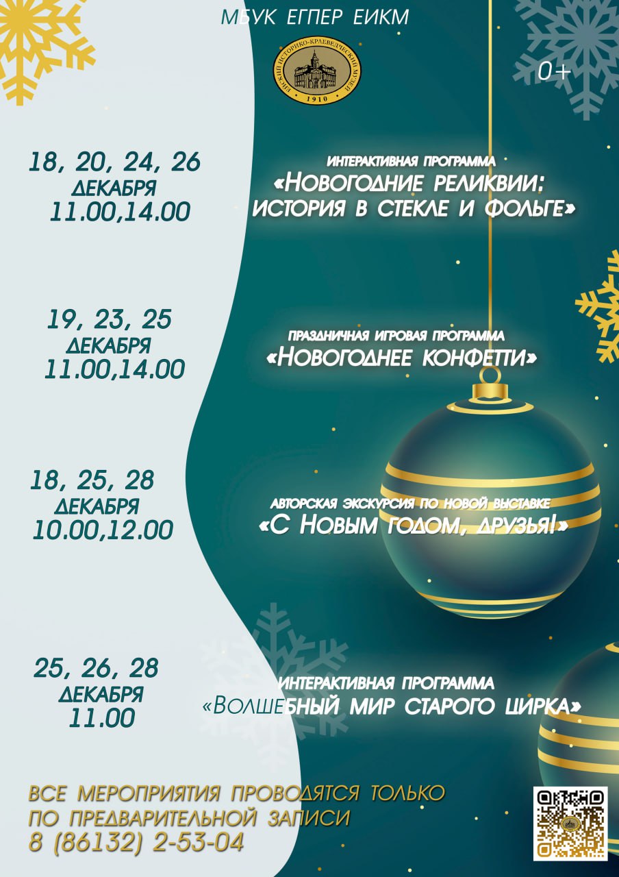 Мы подготовили для вас специальную программу, насыщенную интересными выставками, интерактивными программами и экскурсиями. Вы сможете погрузиться в мир новогодних традиций и узнать много нового о праздничных обычаях Кубани.