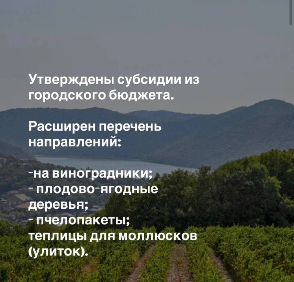 Благодаря поддержке администрациям Краснодарского края и муниципалитета, в этом году 17 предприятий – сельхозтоваропроизводителей получили субсидии на общую сумму порядка 119 млн рублей, которые были направлены: на создание новых виноградников, уход, проведение агротехнологических работ, страхование и многое другое.
