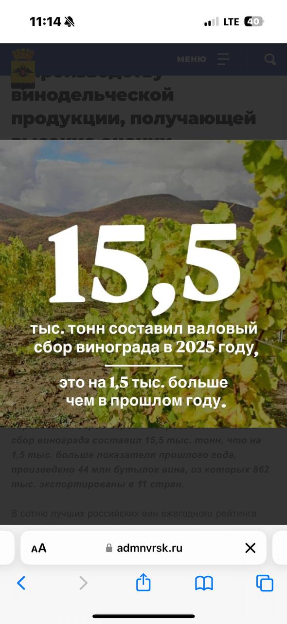 В 2025 году на территории муниципального образования город-герой Новороссийск валовый сбор винограда составил 15,5 тыс. тонн, что на 1,5 тыс. больше показателя прошлого года, произведено 44 млн бутылок вина, из которых 862 тыс. экспортированы в 11 стран.