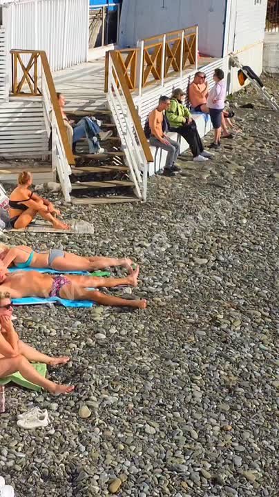 Как говорит за кадром автор видео, температура воды в море сегодня была +14 градусов. Для водных процедур немного прохладно. Но посидеть на пляже – можно. В купальнике.