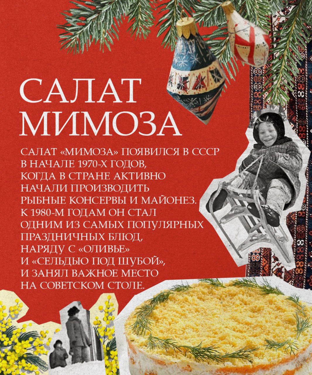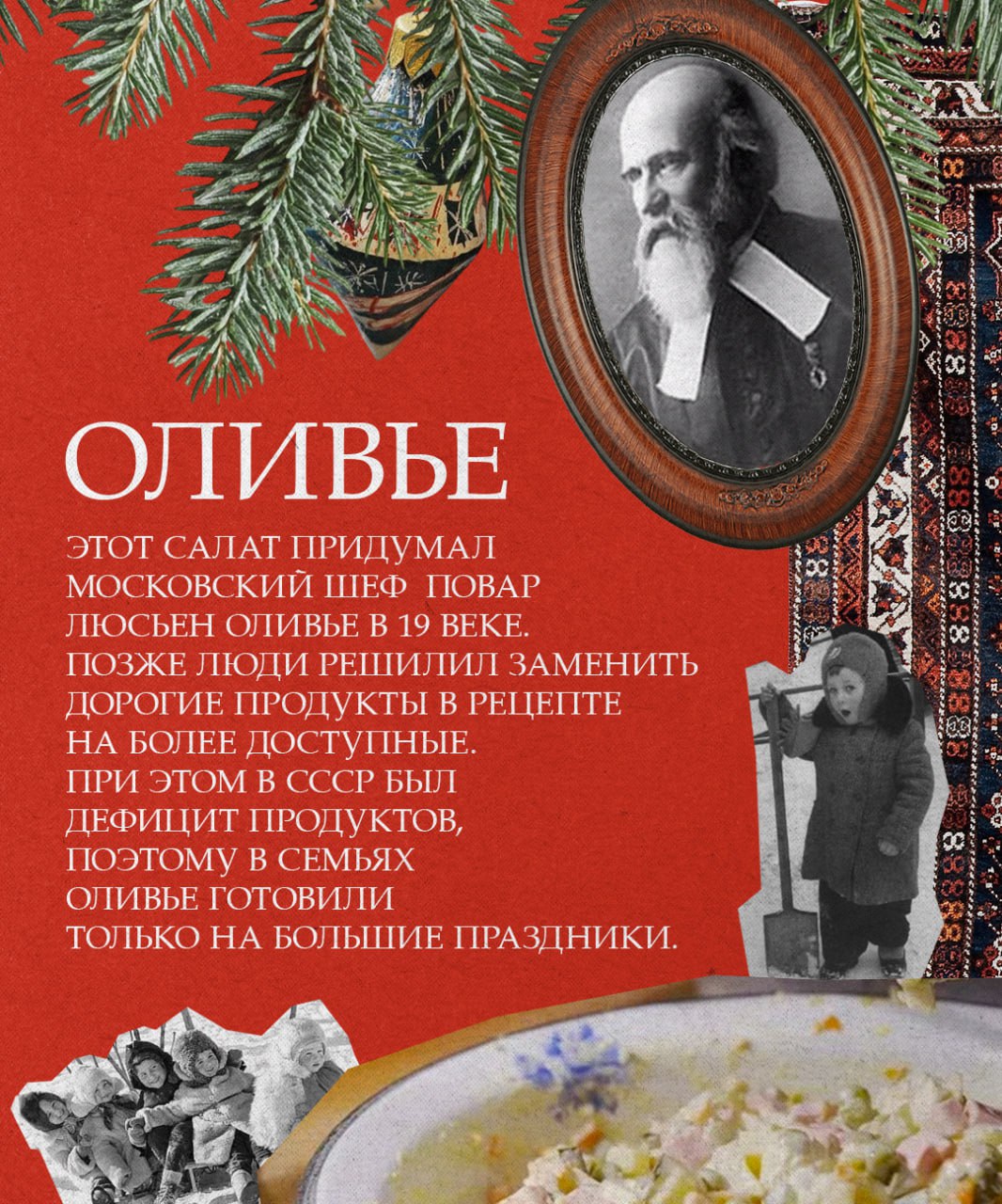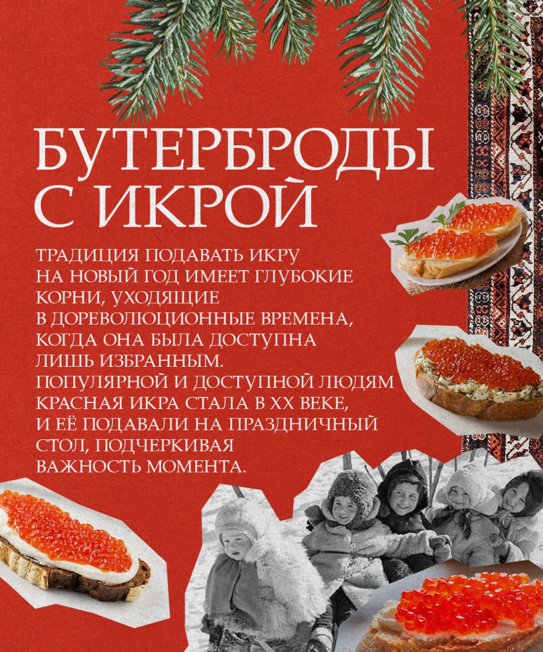 Каждый Новый год меню россиянина на праздничный стол примерно одинаковое – во главе стола всегда стоят любимые блюда, например, оливье, селедка под шубой, бутерброды с икрой и другая традиционная еда. У многих из них очень интересная история происхождения, поэтому о главных новогодних бестселлерах рассказали в карточках