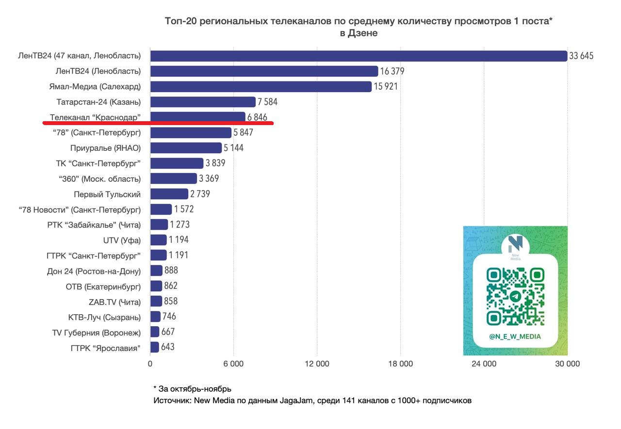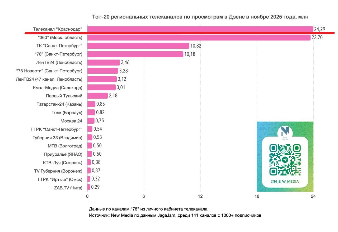 Появилась статистика региональных каналов в Дзен за ноябрь. Согласно ее данным, наш Дзен обогнал такие издания, как «360» и ТК «Санкт-Петербург», расположившись на первом месте с суммарным показателем 24,29 млн просмотров.