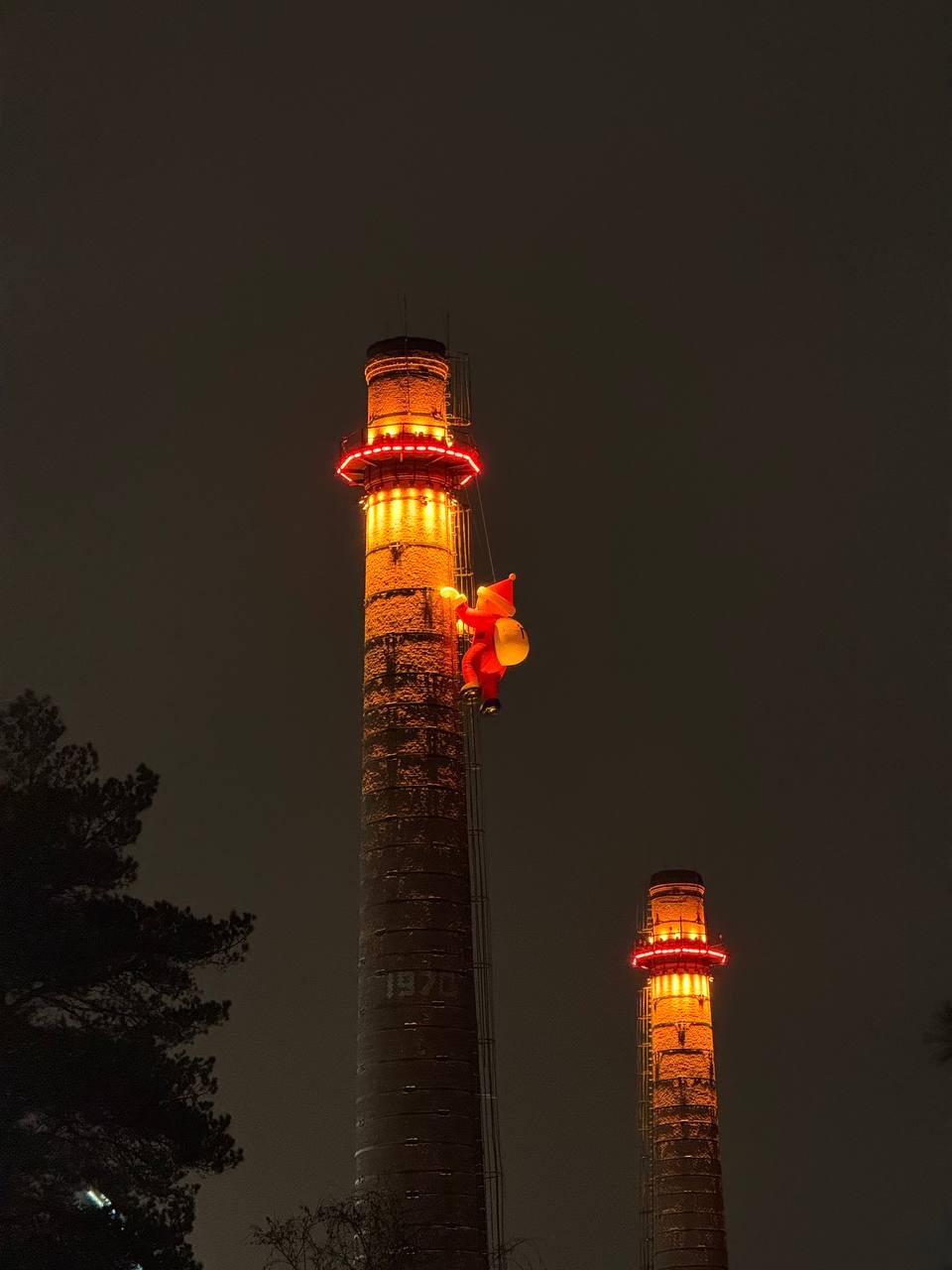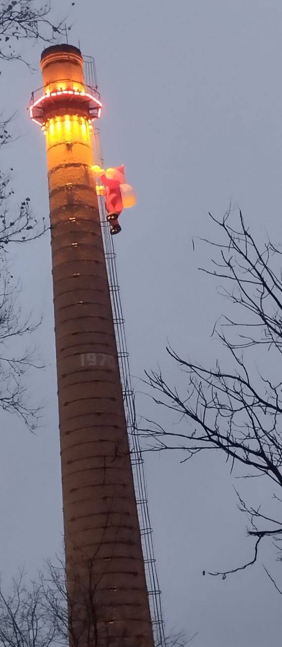 Горожане заметили на улице Лизы Чайкиной необычный новогоднее украшение. Надувной Дед Мороз с мешком на спине «забрался» на котельную.