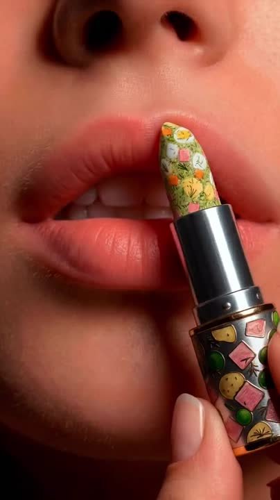Например, помада из оливье, икры, мандаринов. Также есть «елочная» идея – зеленый цвет и красные стразы.