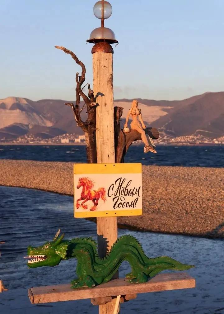 Знаменитое место в Новороссийске украсили вот такими символами праздника. Это ёлка и лошадка.