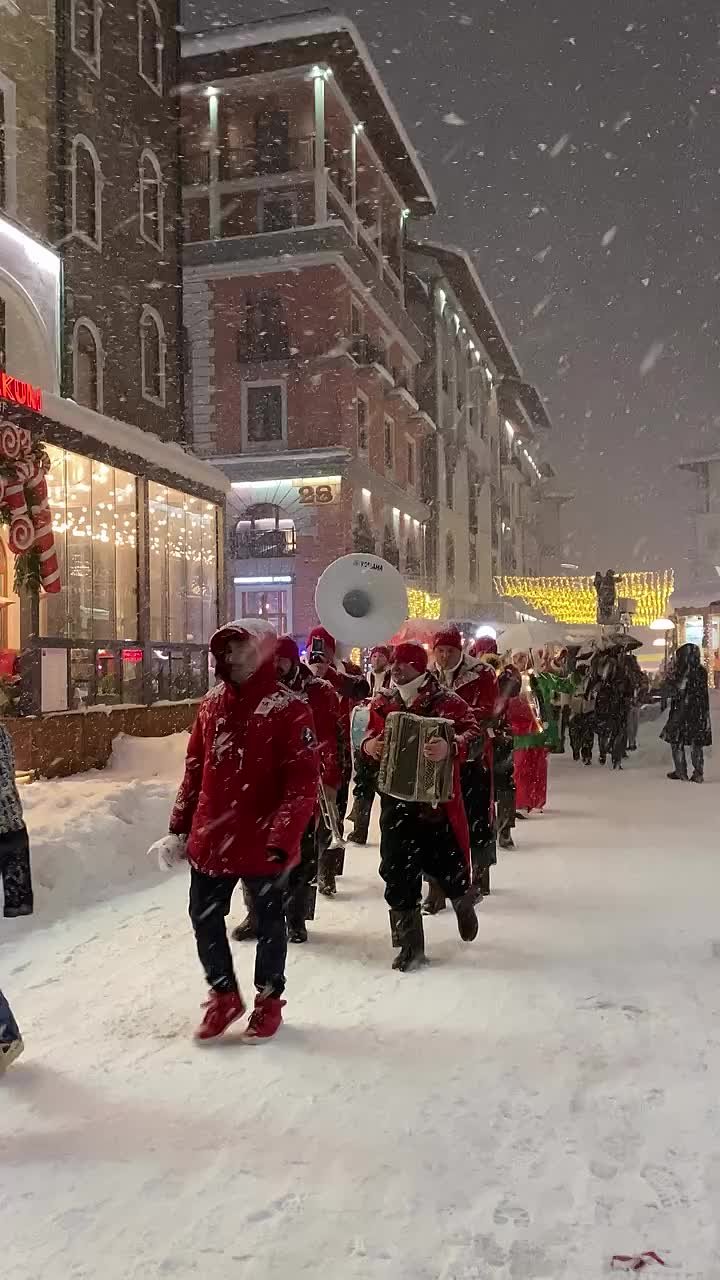 Праздничный волшебник со своей свитой прогулялся по украшенным улицам прямо в разгар снегопада.