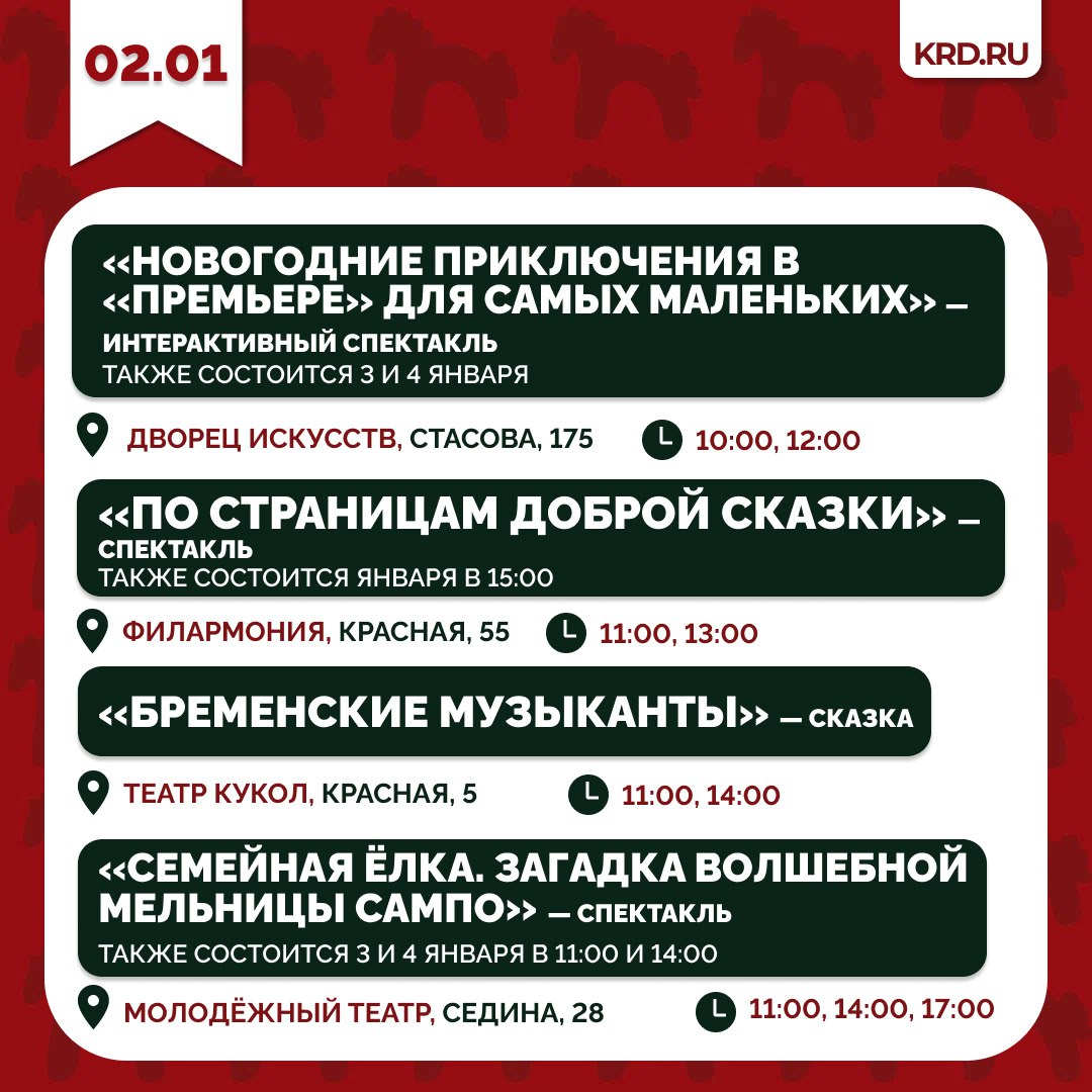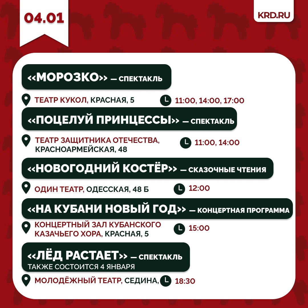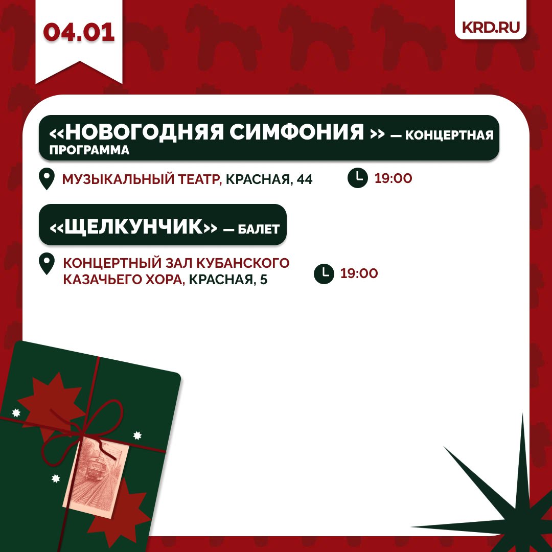 Подготовили для вас культурную афишу на 1-4 января. Балет, концертные программы и многое другое подготовили краснодарские театры для жителей и гостей города.