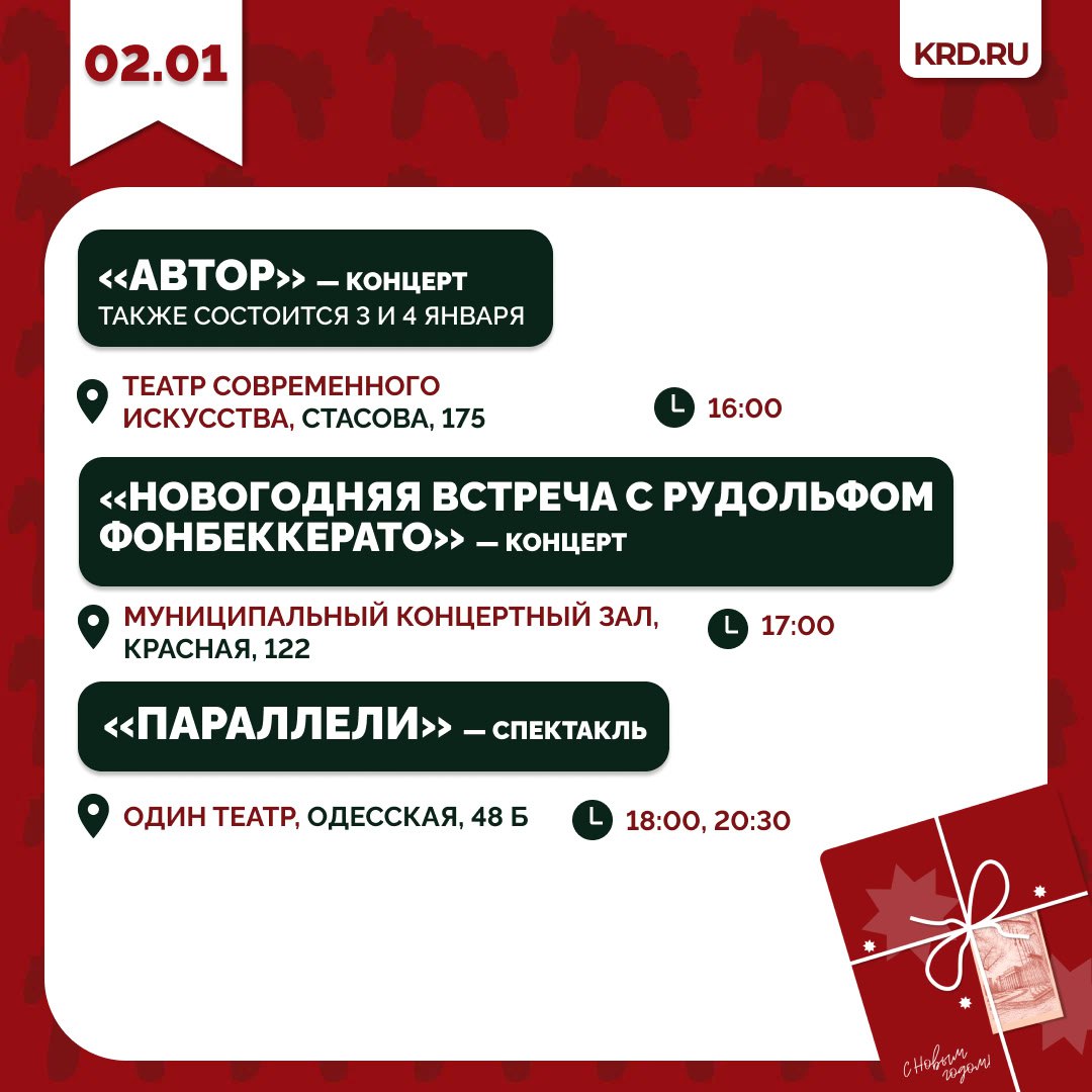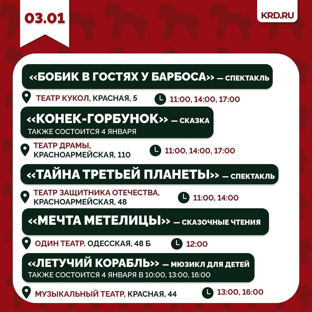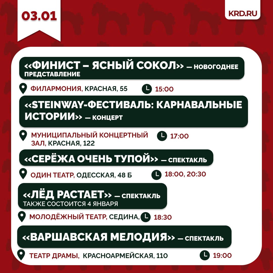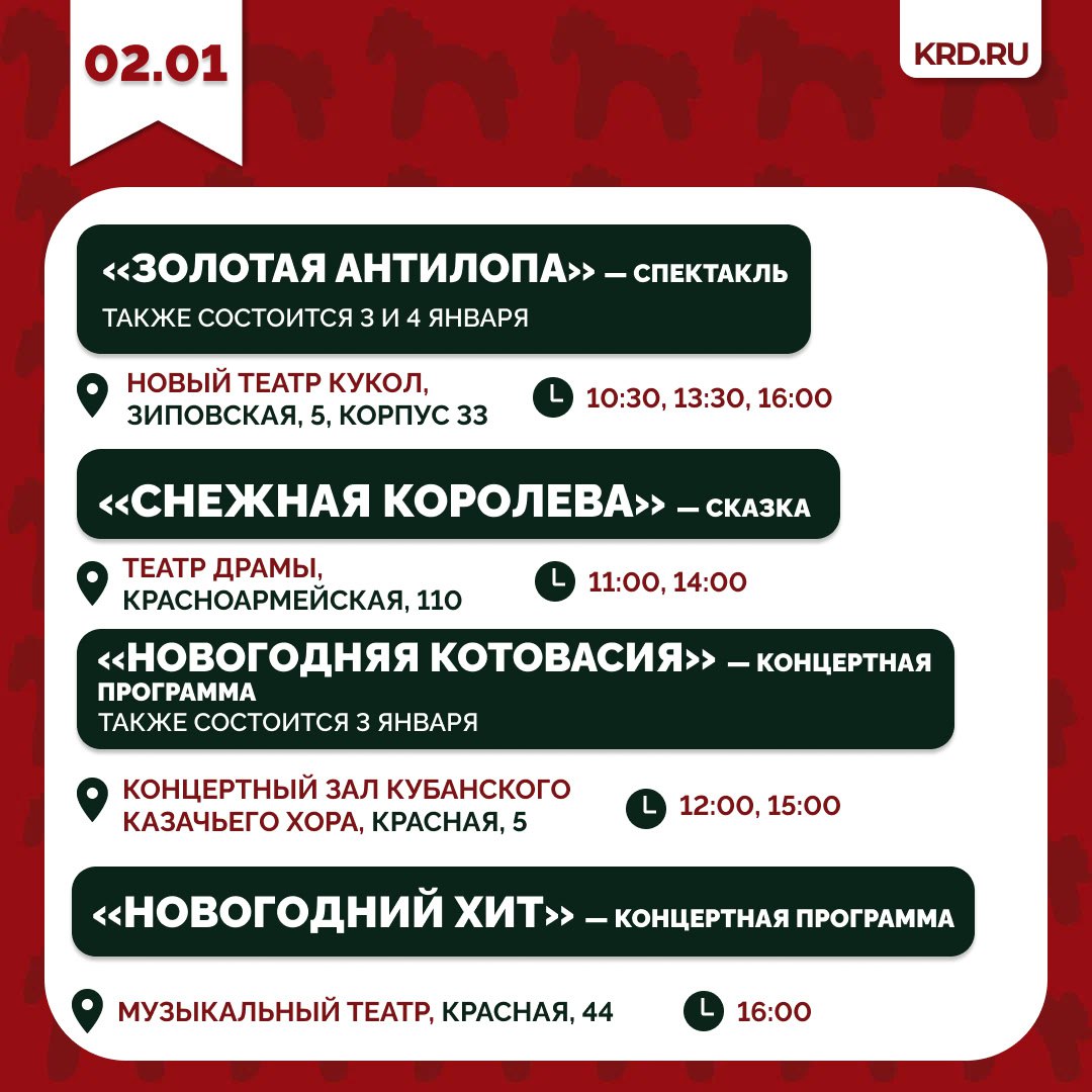 Подготовили для вас культурную афишу на 1-4 января. Балет, концертные программы и многое другое подготовили краснодарские театры для жителей и гостей города.