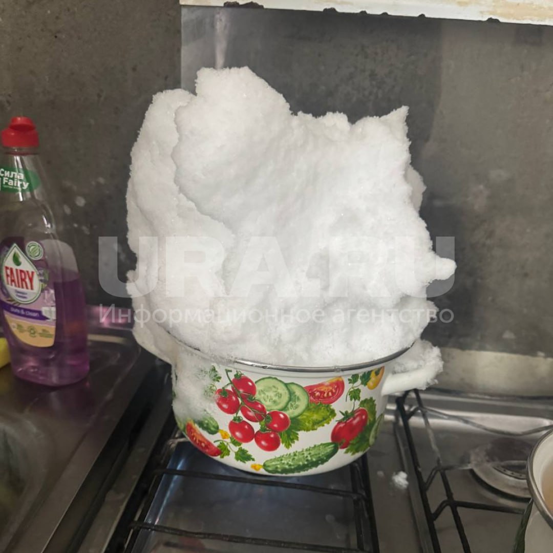 Местным жителям приходится топить снег, чтобы хоть как-то получить воду. Спецтехника работает круглосуточно, но машины застревают в кюветах из-за толщи снега и льда.