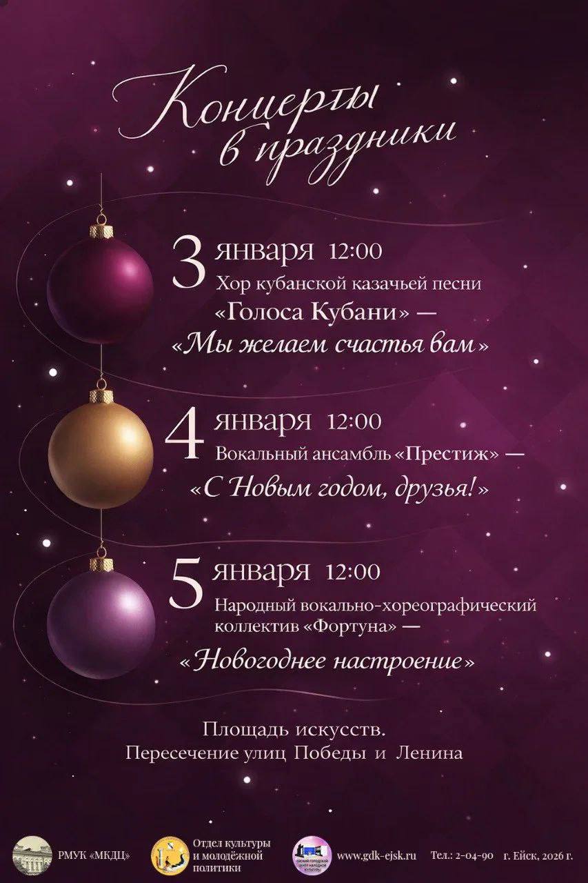 Но праздничное настроение продолжается — с радостью приглашаем вас в Ейский городской дворец культуры им. А. А. Колесникова, где вас ждут яркие события: