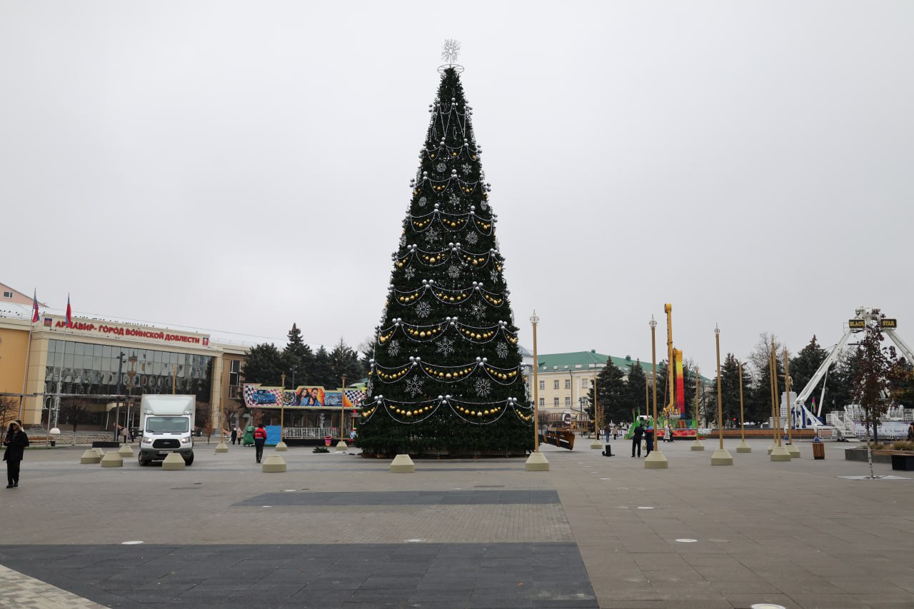 Это роскошная ёлка Армавира! Новогоднее дерево установлено на главной городской площади. Тут же заметили украшения в виде сфинксов.