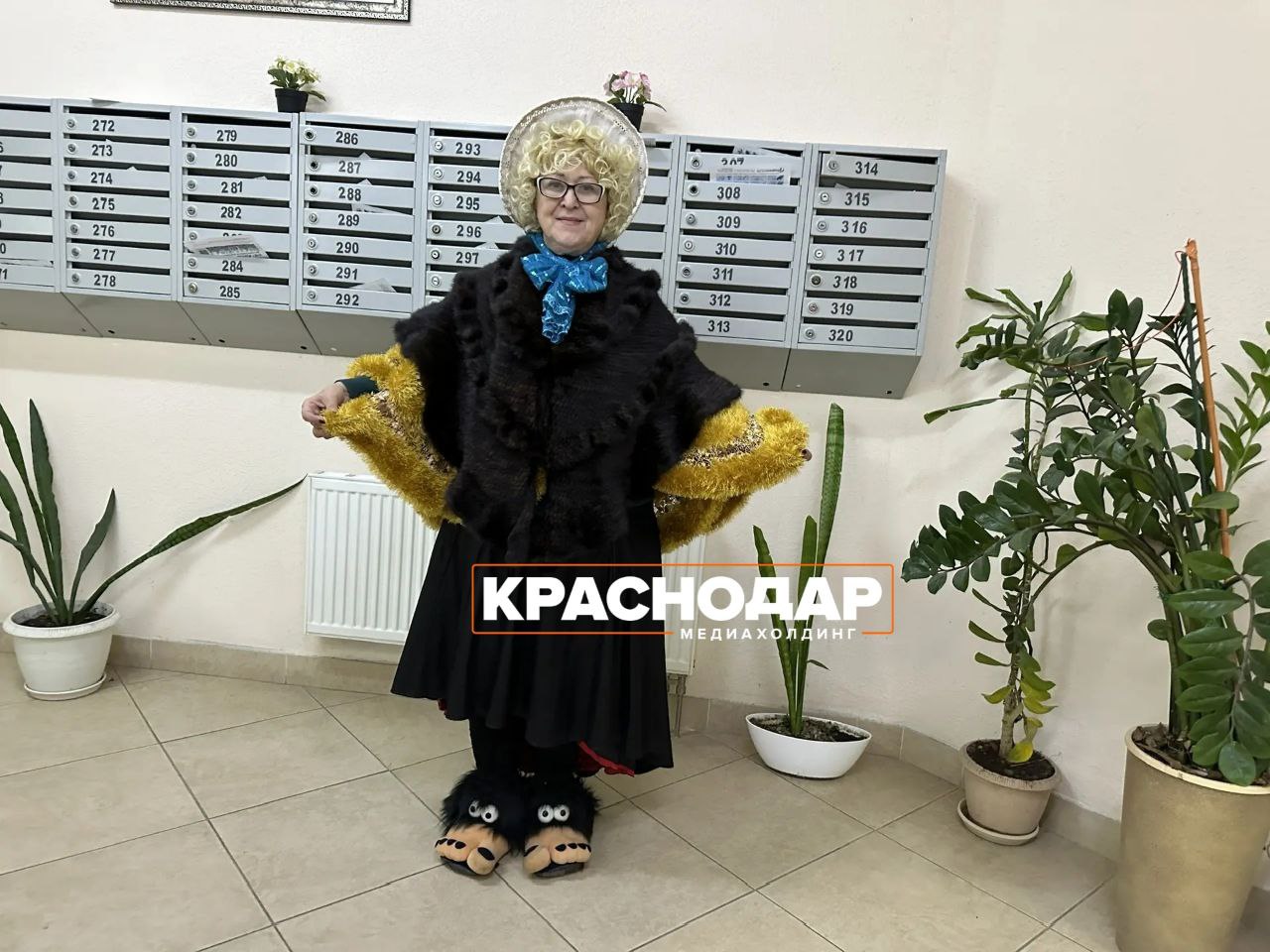 Консьержка одного из домов на улице 40-летия Победы поздравляет всех с праздником в образе черепахи Тортиллы и дарит конфетки на счастье.