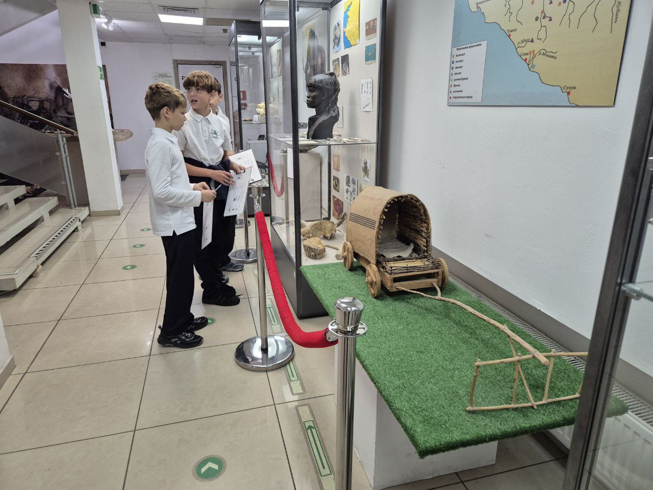 Дети смотрят выставку «От камня до металла. Археологическая история Краснодарского края», а потом примеряют на себя роль первобытных людей.