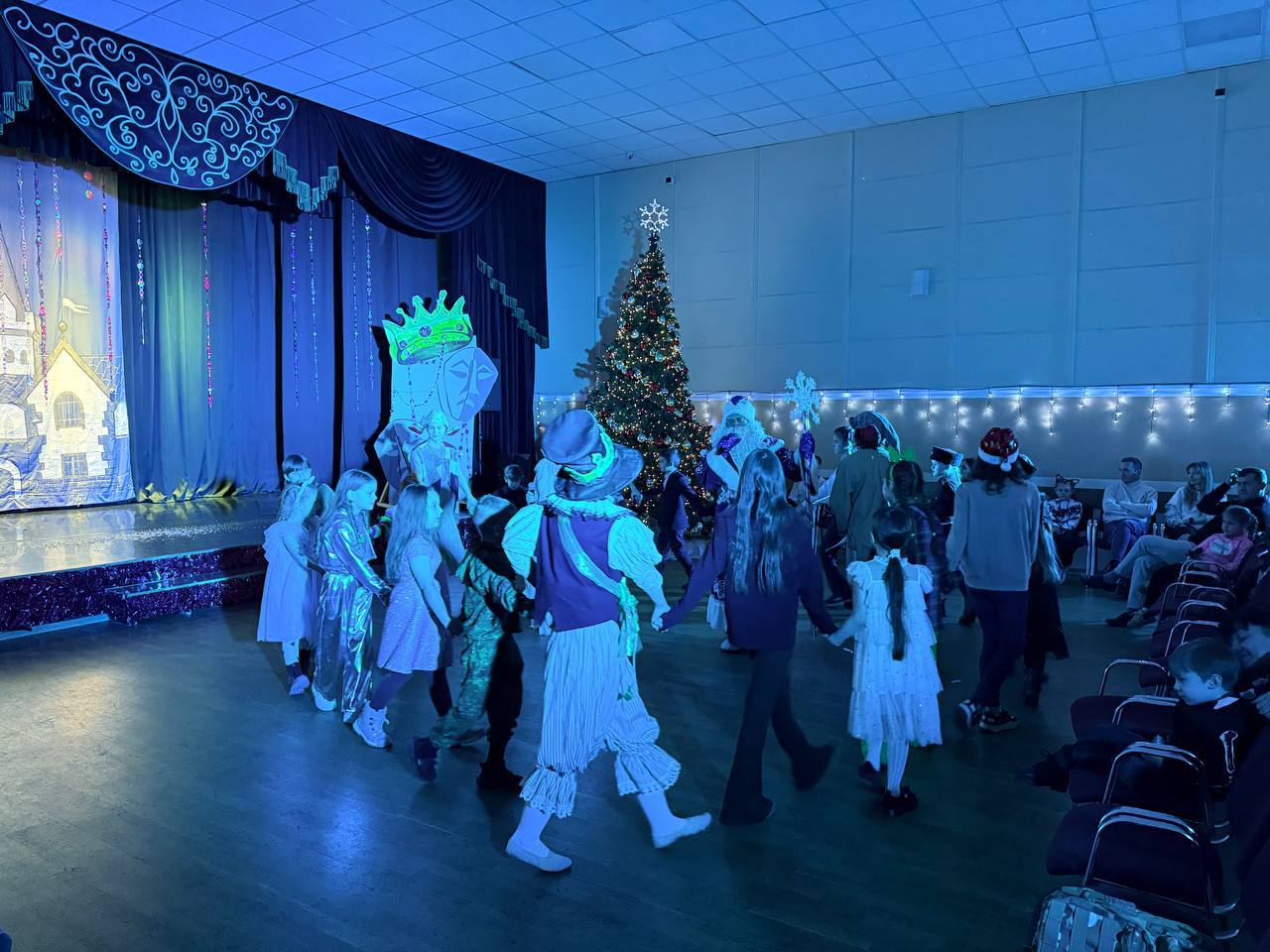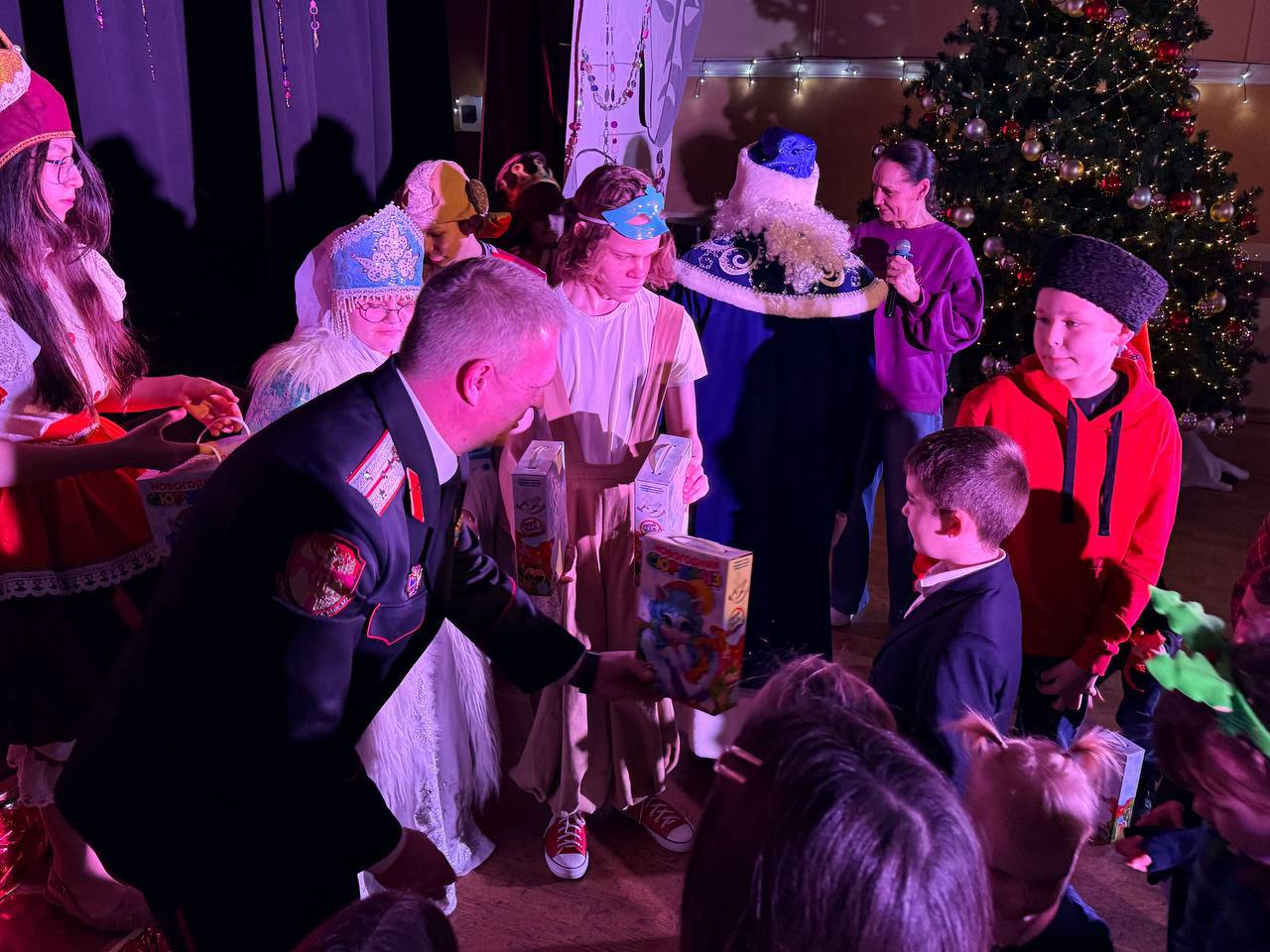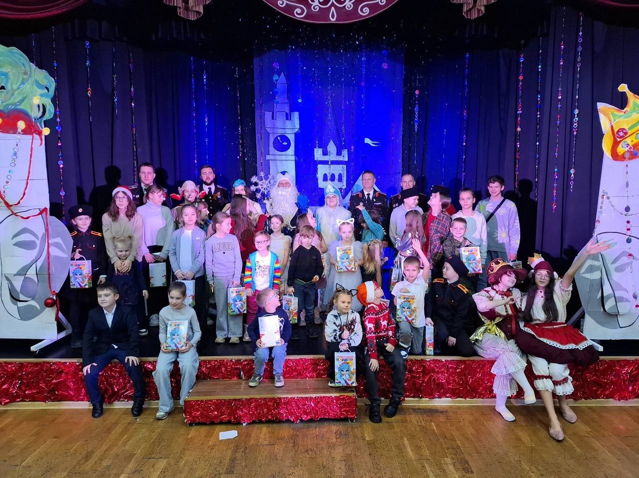 Коллектив ДК подготовил новогоднее шоу с Дедом Морозом, Снегурочкой и сказочными персонажами, подарившее юным казачатам море позитива, смеха и волшебства. Также ребятам вручили сладкие подарки от казаков районного общества.