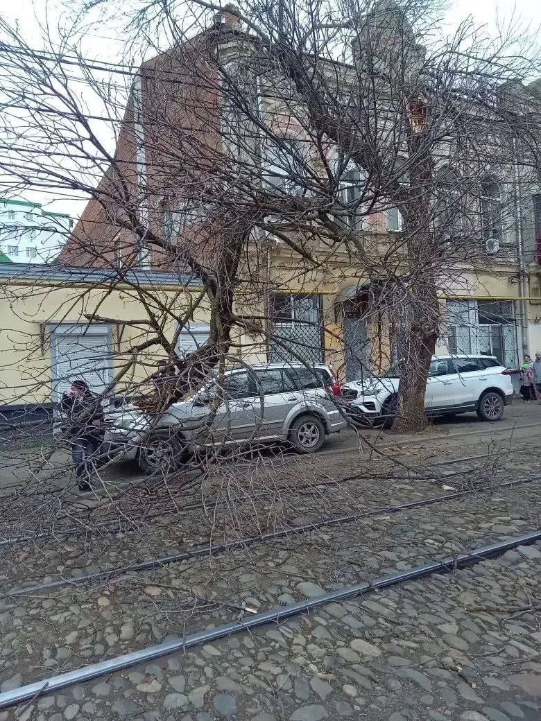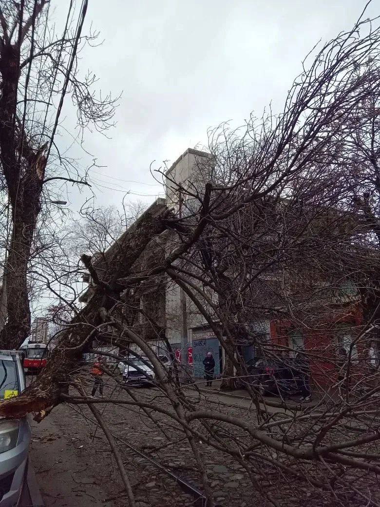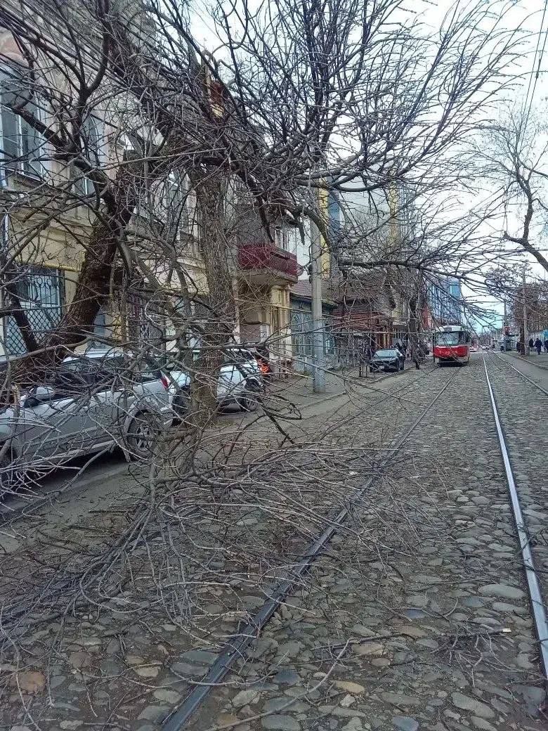 Упавшее дерево заблокировало трамвайное полотно в Краснодаре