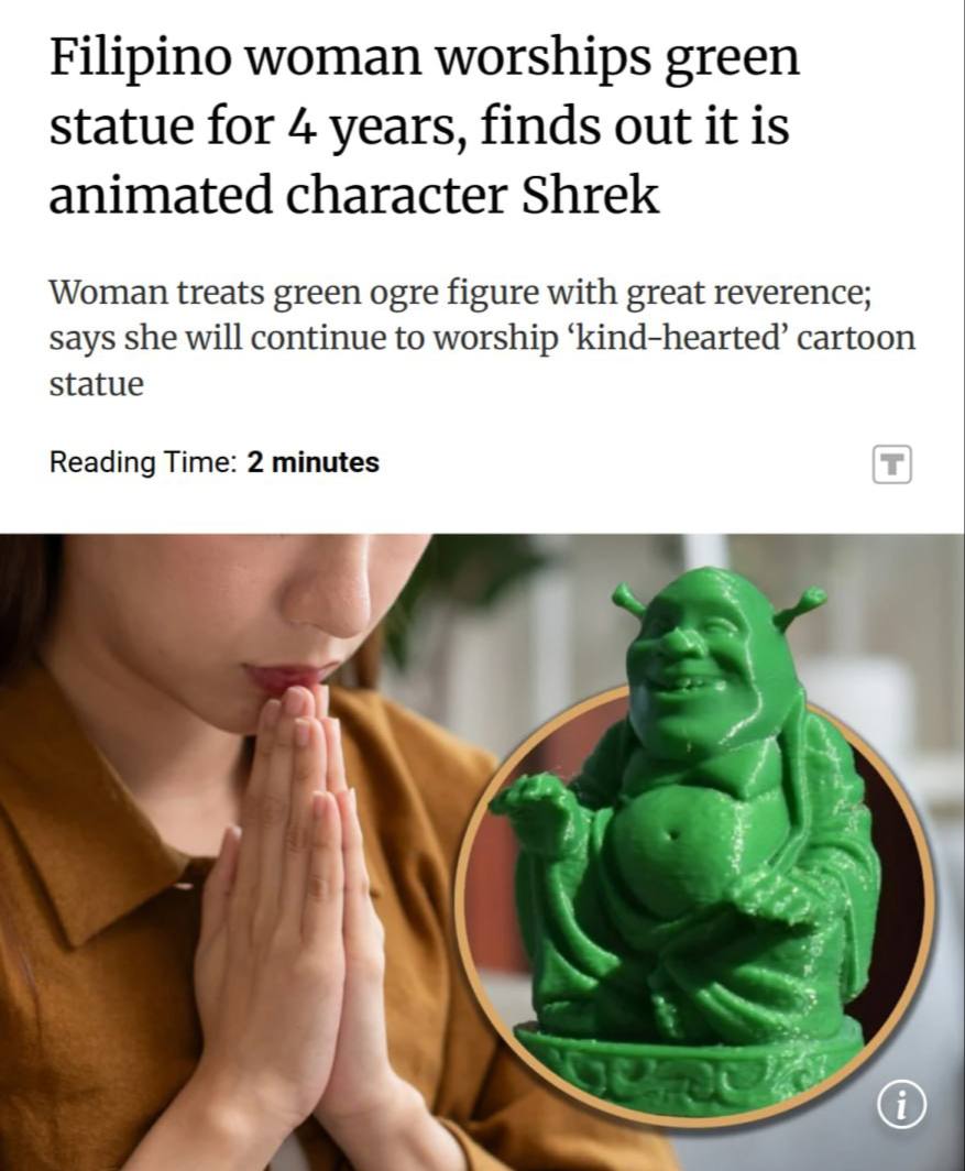 Женщина купила в сувенирной лавке зелёную «статуэтку Хотэя» — божества счастья и веселья. Она возносила ему молитвы каждый день, пока знакомые не открыли правду: «божество» оказалось огром из мультфильма «Шрек».