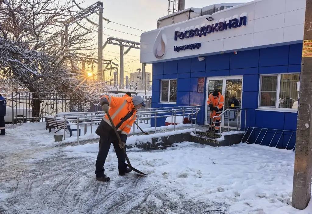 Сотрудники городских предприятий присоединились к очистке улиц Краснодара от снега. В уборке приняли участие более 60 работников «Краснодар Водоканала».